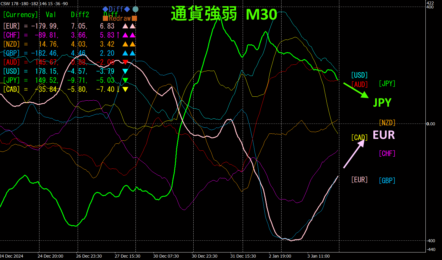 ピンク色がEUR、緑色がJPYです。EURが下向き、JPYが上向きになっているので、今後、EURJPYは、やや下落方向に進むものと考えられます。