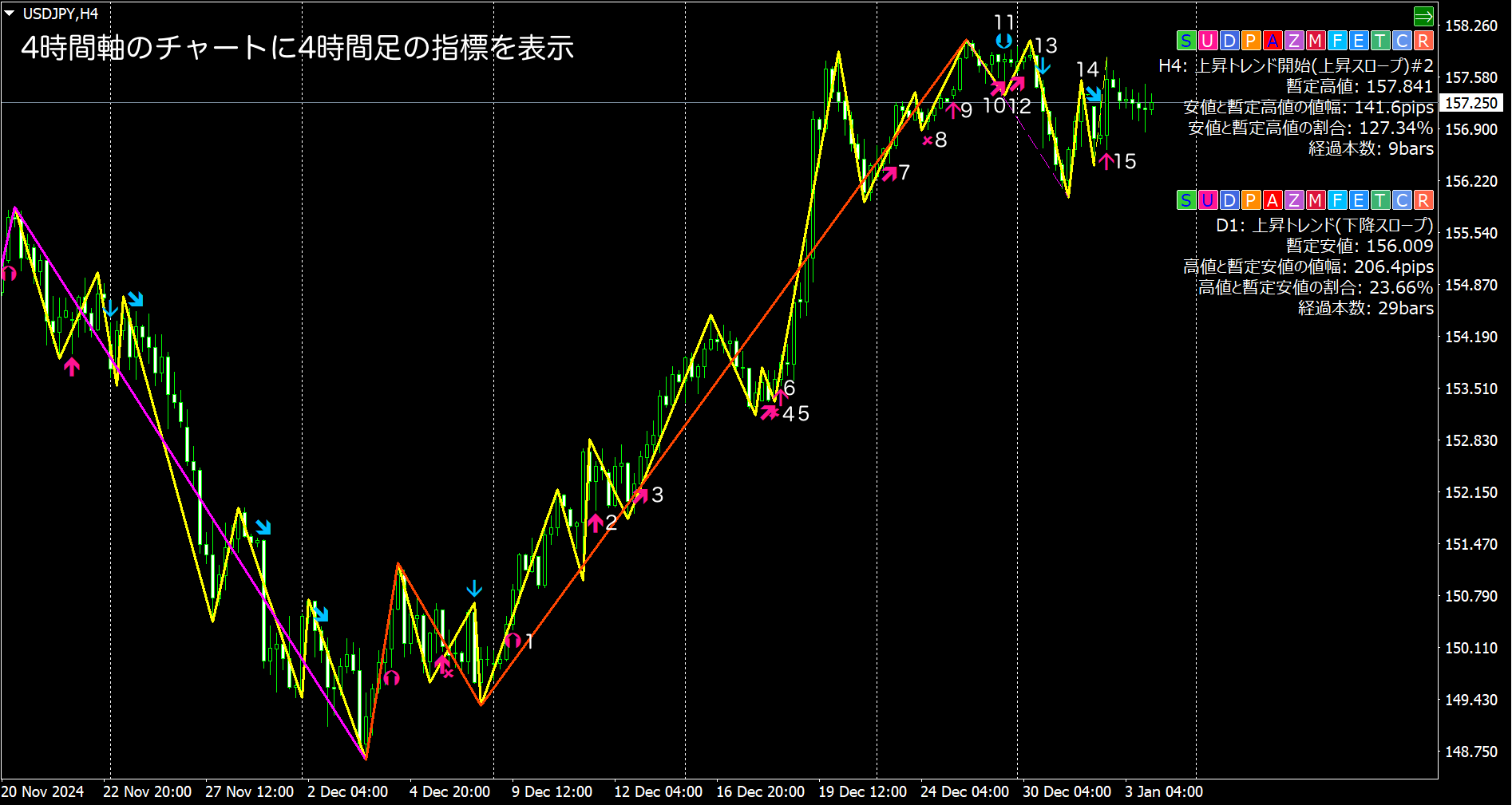 - 4時間足のシグナルを活用して短期的なエントリーやエグジットポイントを精査