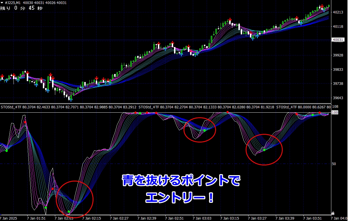※ サイン点灯=エントリーではありませんので、インジケーターが緑帯をすくい上げるような形状でない場合は、エントリーしません(サイン点灯でエントリーできる頻度は、数回に1度くらいです)。