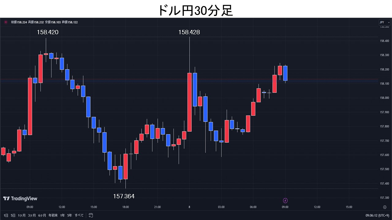 東京時間、ドル円は日経平均の大幅反発を受け、リスク・オン状態となると、昨年7月以来となる158.42円まで上昇。その後は本邦長期金利の上昇や加藤財務相の円安けん制発言などを受けて157円台に失速。欧州時間、ドル円は上値が重く157.36円まで下落。NY時間、12月米ISM非製造業景況指数が54.1(予想53.3)・11月米JOLTS求人件数が809.8万件(予想770.0万件)と強い内容となると、米10年債利回りの上昇とともに、ドル円は158.42円まで上昇。その後、アジア時間の同水準上抜けに失敗すると失速。また、トランプ次期米大統領が「金利は高すぎる」と発言したことなども嫌気されて、ドル円は157.58円まで下押しとなった。