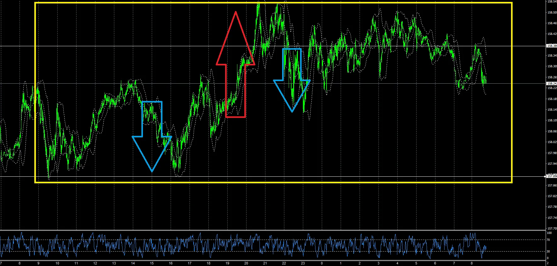 億トレユーザーの皆様は、できれば真ん中赤矢印場面の、売りから買いに変わって上昇して行く様子を頭に入れておく事です。