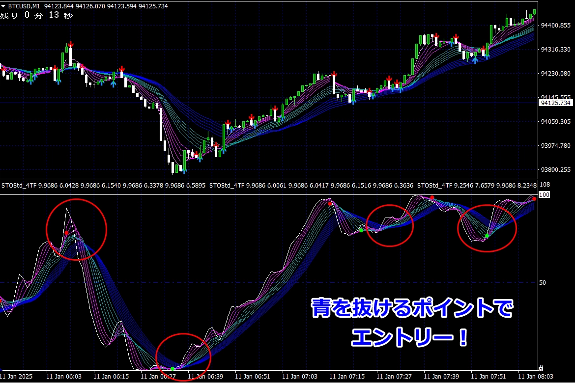② 矢印サイン点灯状態で、インジケーターのピンク色の帯が、緑の帯を下からすくい上げるような形状であれば、現在のローソク足が確定する数秒前か確定の直後に1分判定または3分判定でハイエントリーします。