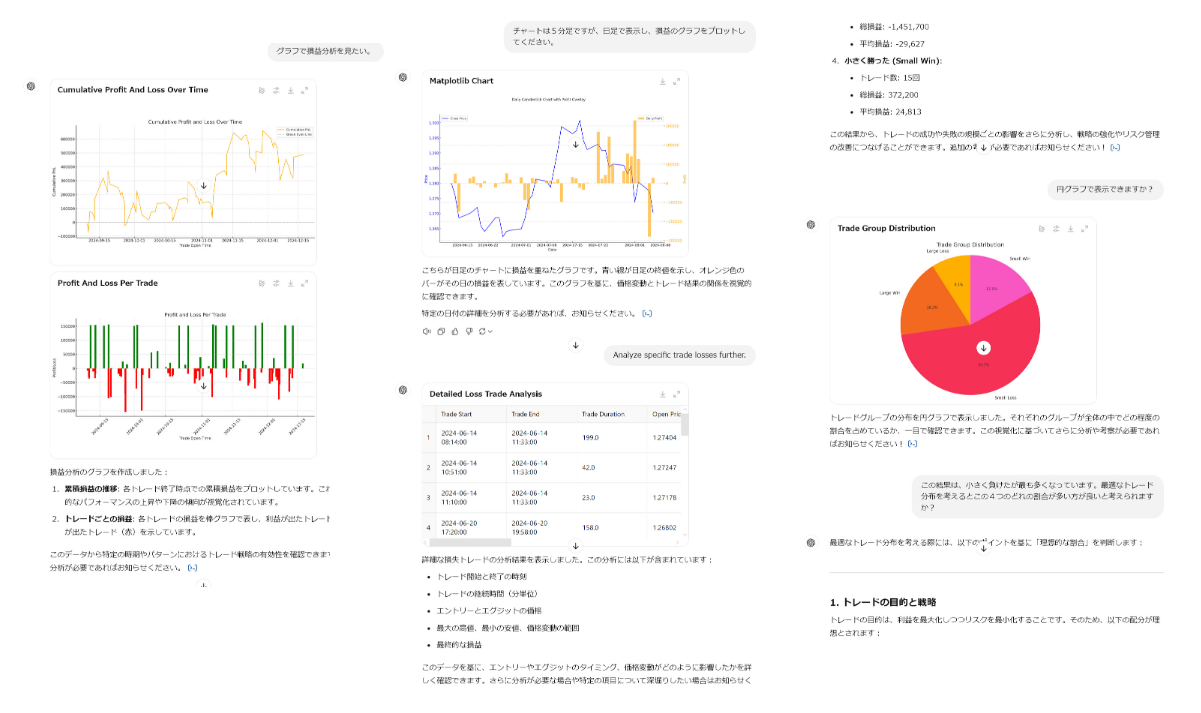 トレード内容が芳しくなくても、否定的な表現は避け、建設的なフィードバックを提供します。また、何度でも質問可能で、ストレスなく利用できます。人間相手では遠慮してしまうこともAI相手なら、気にする必要はありません。
