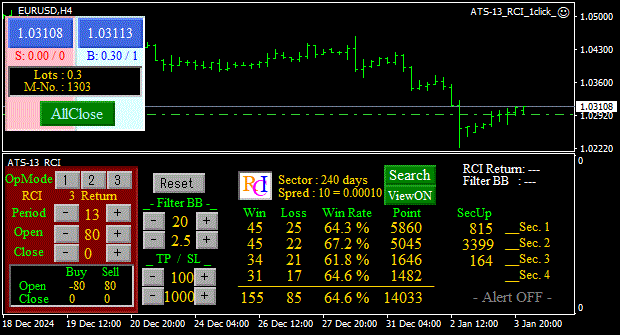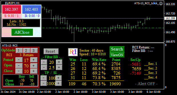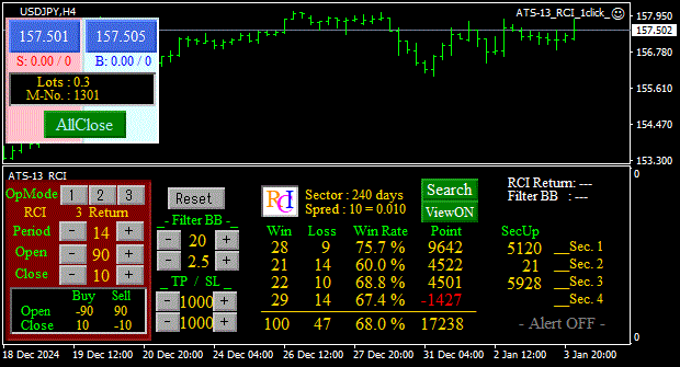 全体的な傾向として、H4時間足の設定値が比較的安定した成果を挙げていることが確認されました。この傾向を踏まえ、今後も引き続きオートサーチ機能を活用し、安定したパフォーマンスを期待できる設定値を見極めることが求められます。