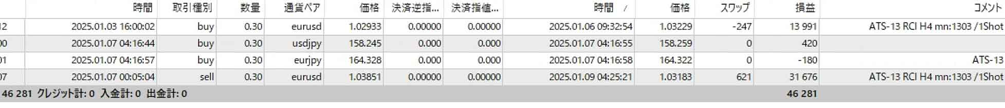 | 設定3 | EURUSD | H4 | 13本 | 100.0% | 2勝0敗 | +45,667円 |