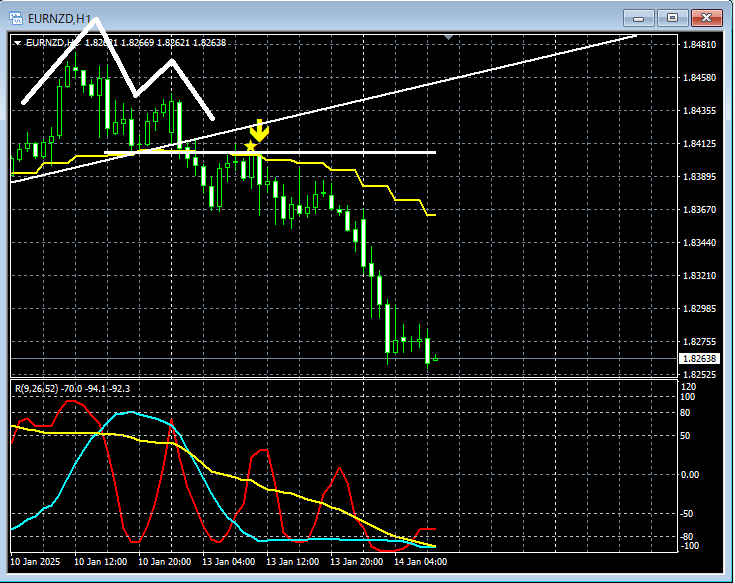 上の1時間足では、ダブルトップを形成して、このケースで上位足の状況から重要視している4時間足EMA21やカウンタートレンドラインを割り込んでいる。