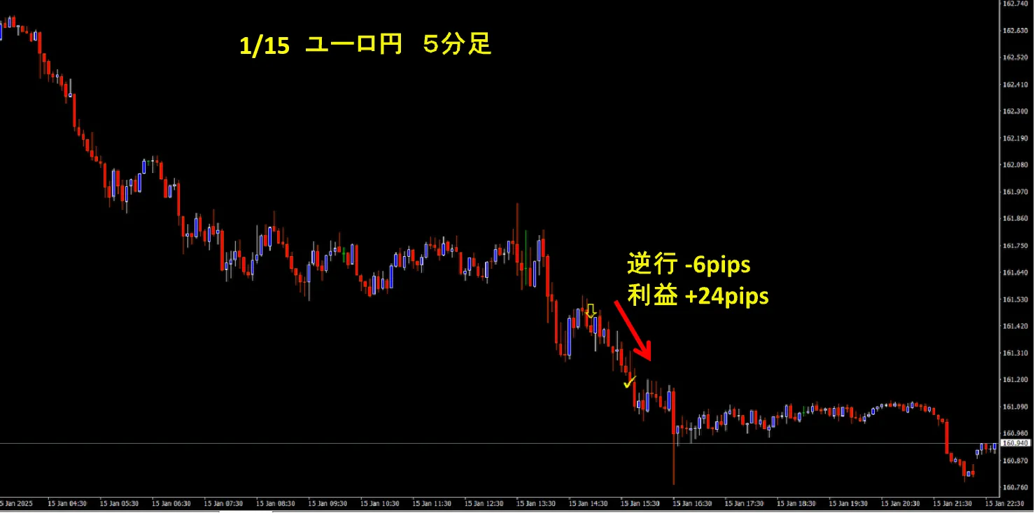 1/15 ユーロ円 エントリーポイント 逆行-6pips 利益+24pips