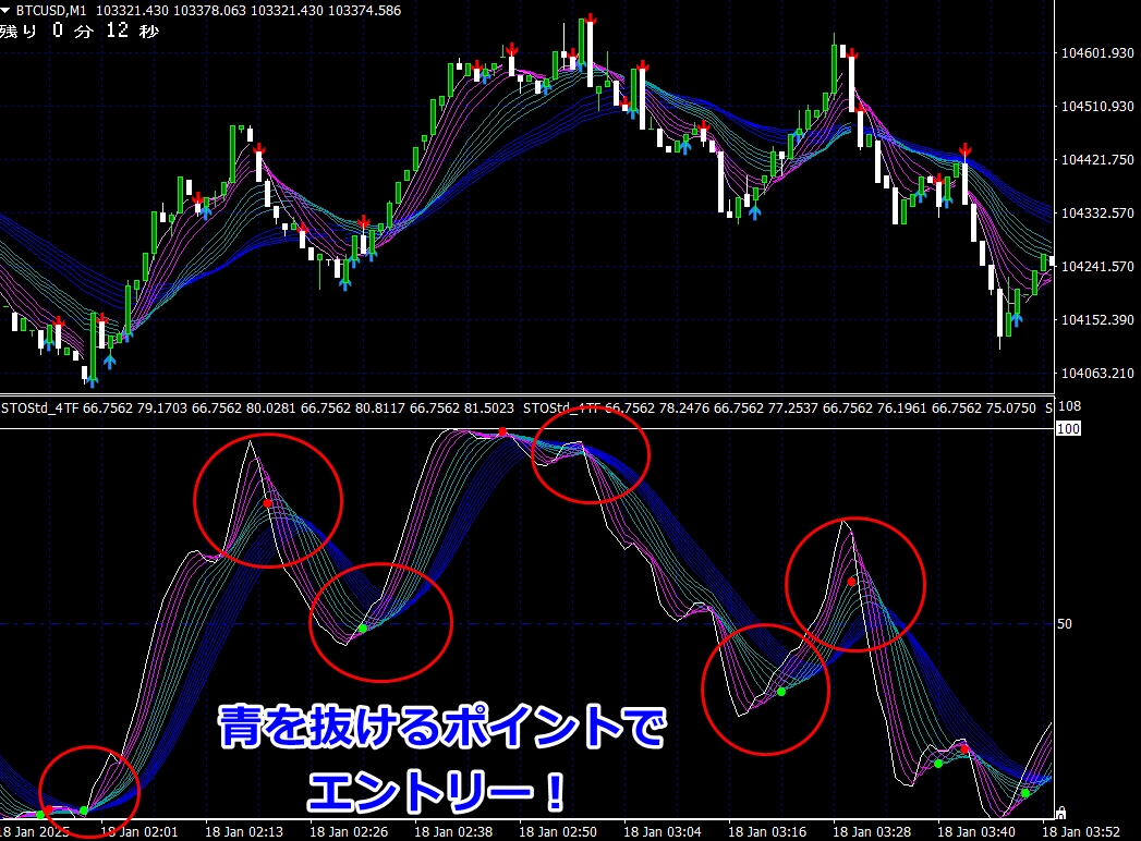 ※ サイン点灯=エントリーではありませんので、インジケーターが緑帯をすくい上げるような形状でない場合は、エントリーしません(サイン点灯でエントリーできる頻度は、数回に1度くらいです)。