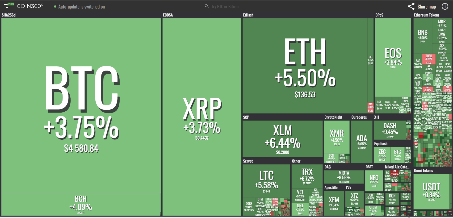 coinmarketcap(コインマーケットキャップ)のサイトから、ドミナンス(各銘柄が仮想通貨全体の時価総額に占めるパーセンテージ)を定点観測していきます。仮想通貨全般が下方向に大きく動き出している相場状況を受け、毎日更新することとし、仮想通貨業界を俯瞰および転換期を早期に発見することを目的とします。