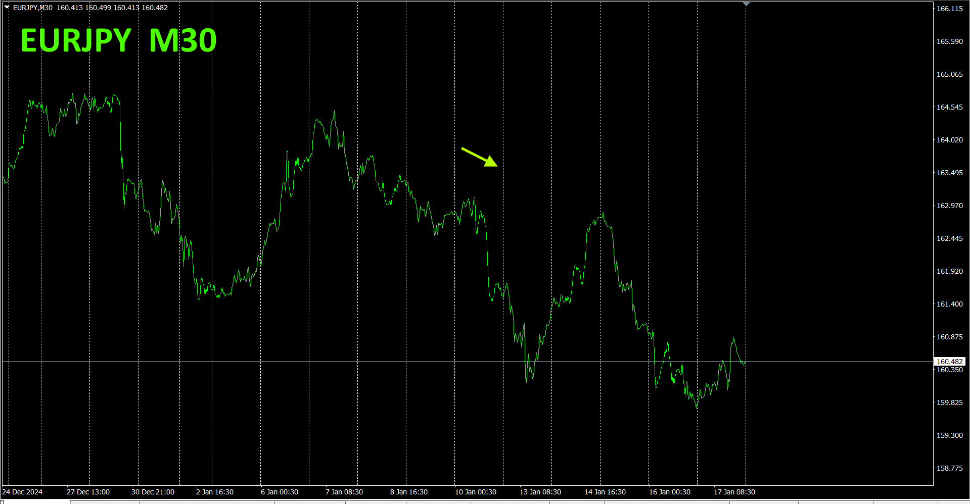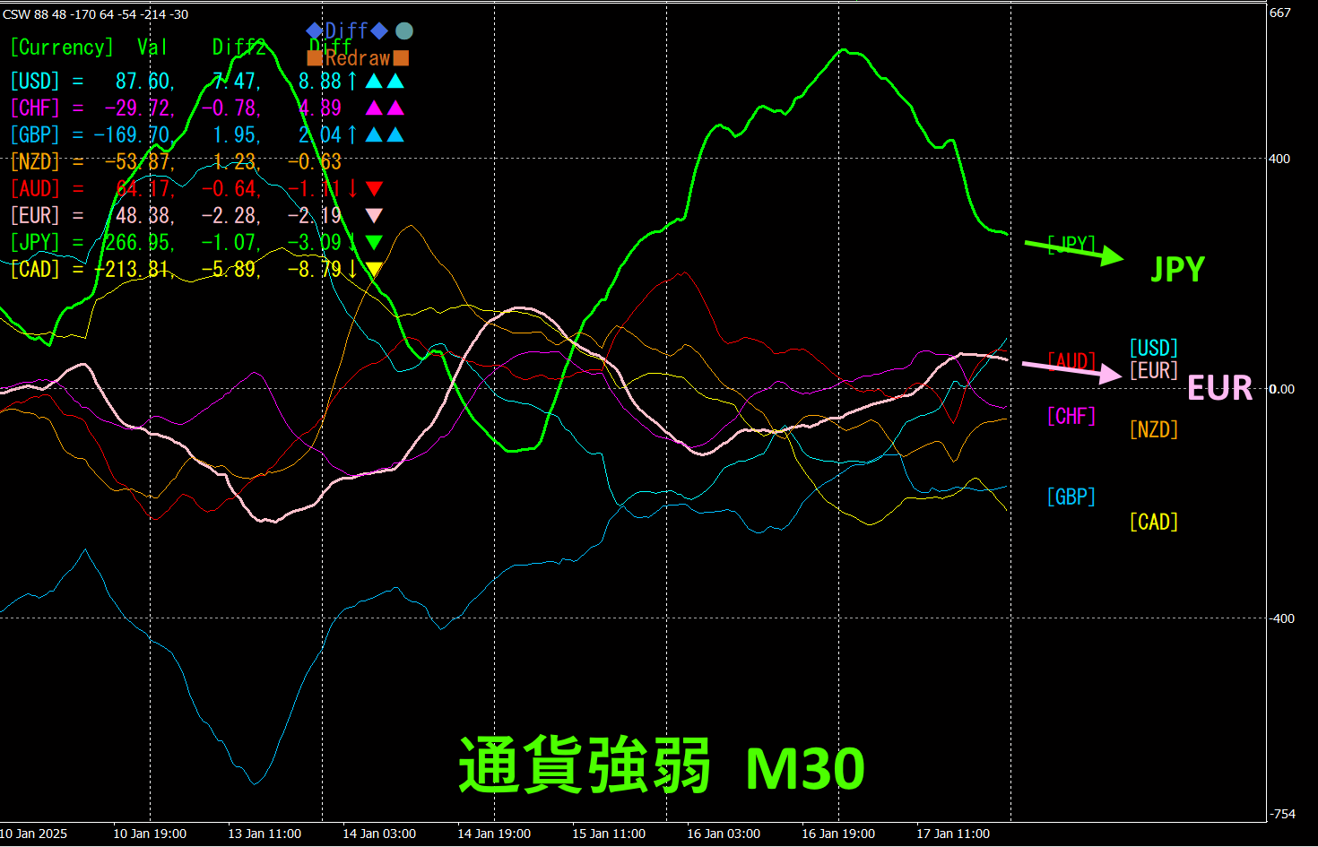 ピンク色がEUR、緑色がJPYです。両者は、大きな波のうねりを作っていて、JPYが大きく上向きに、EURがやや下向きになっているので、今後、EURJPYは、下落が進むと考えられます。