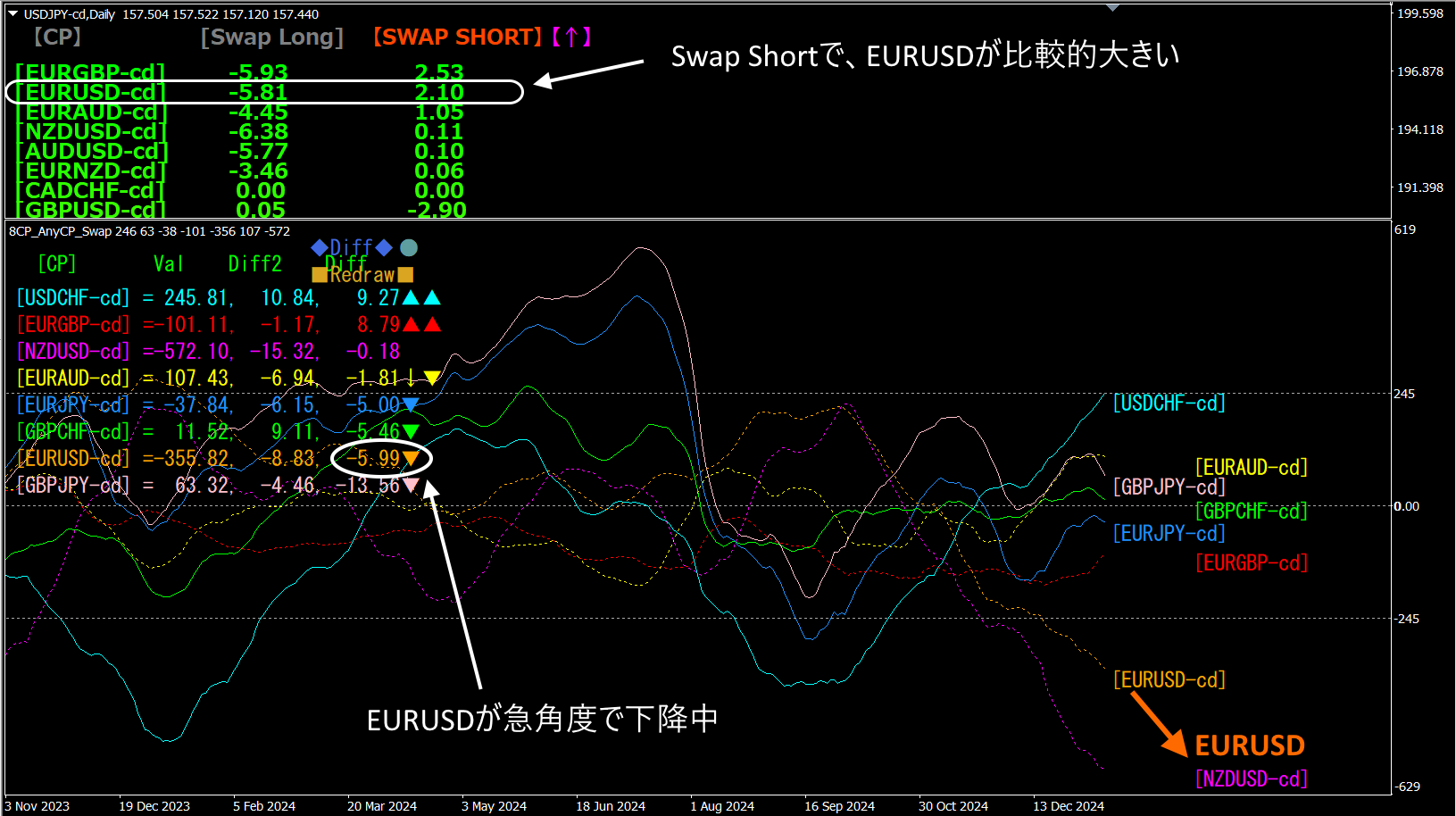 次の図は、売りスワップ狙い通貨ペアとしてEURUSDに注目したものです。