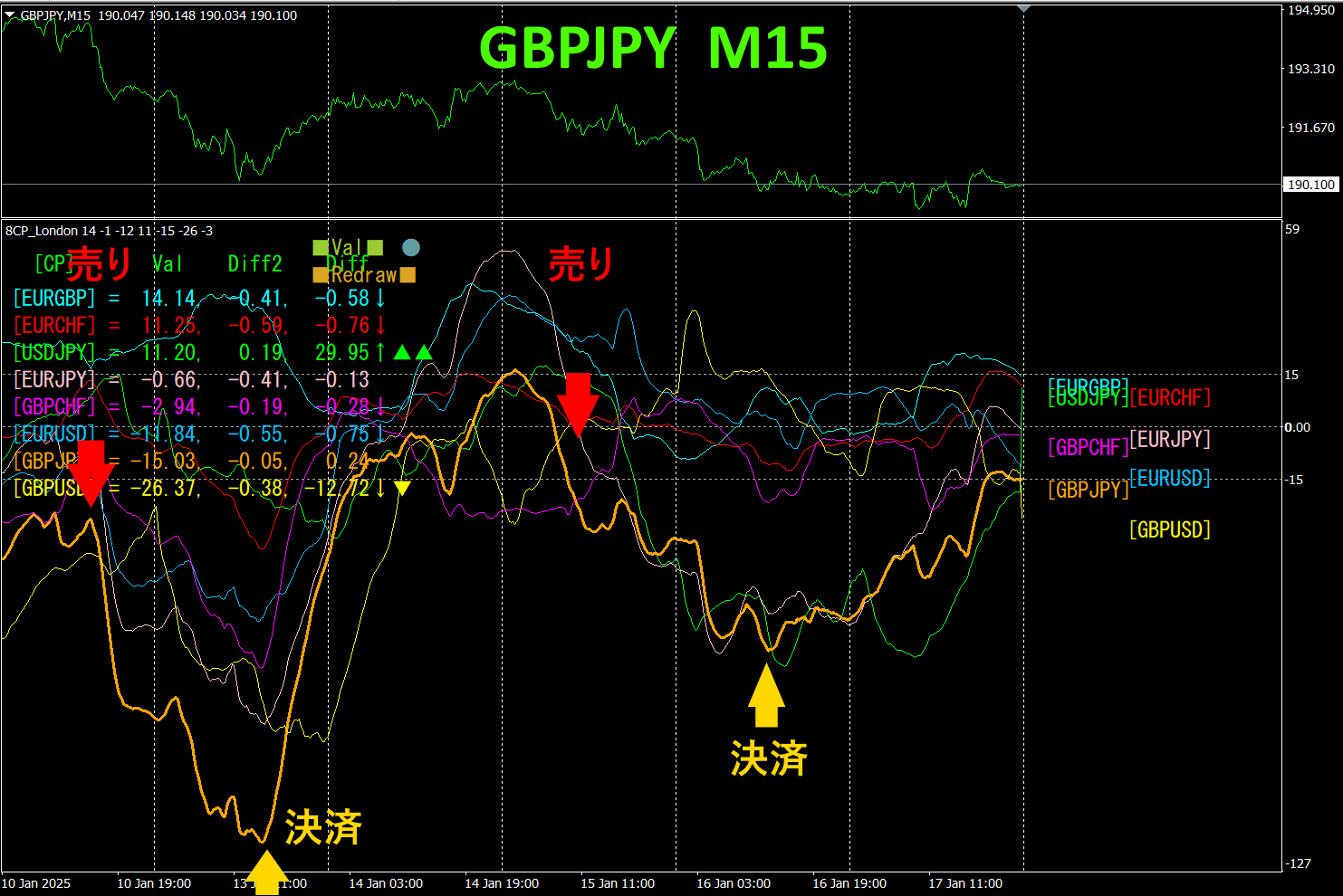 上半分は、GBPJPYの15分足チャートです。下半分は、「8CP見える化インジータ」によるものです、橙色太線のグラフがGBJPYに相当します。