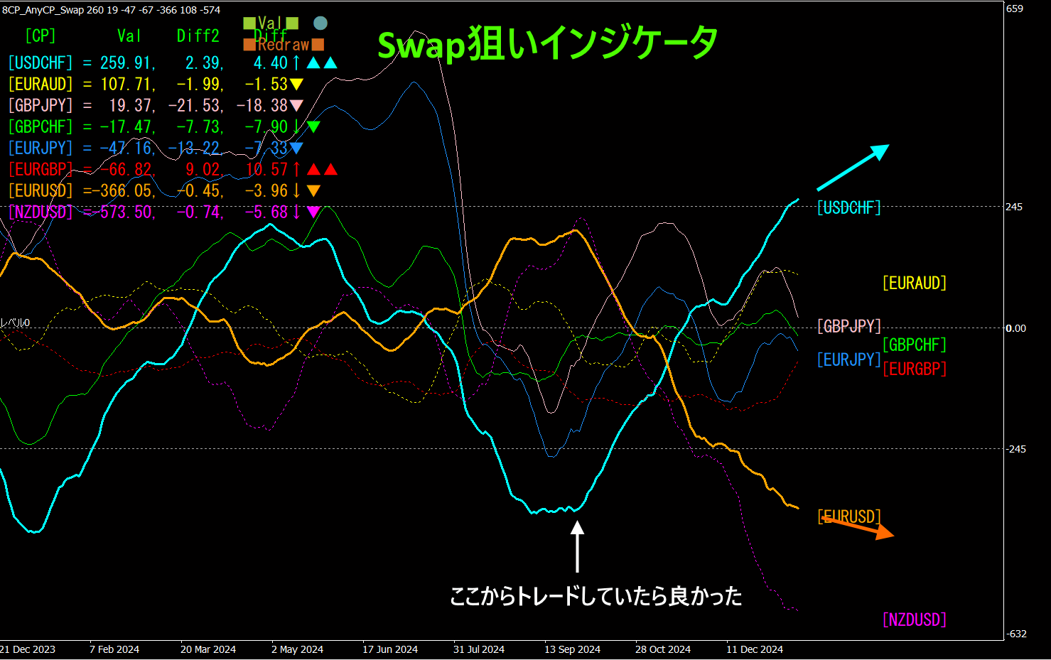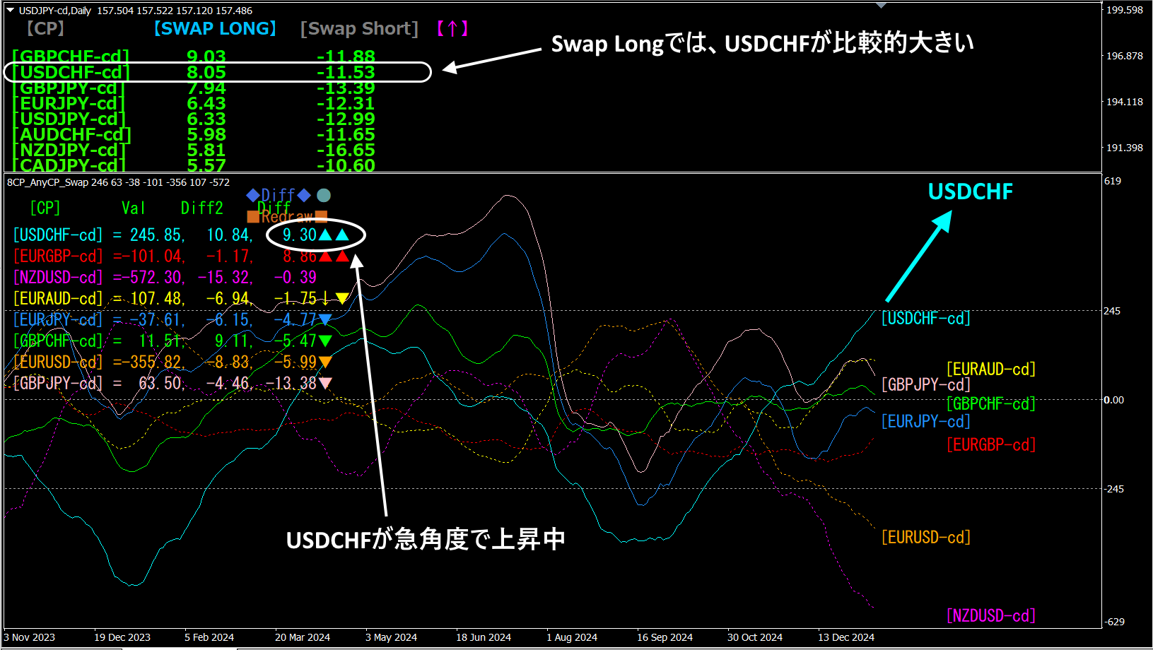 従って、USFCHFを買い、EURUSDを売れば、スワップ益と為替差益が同時に狙えることになります。