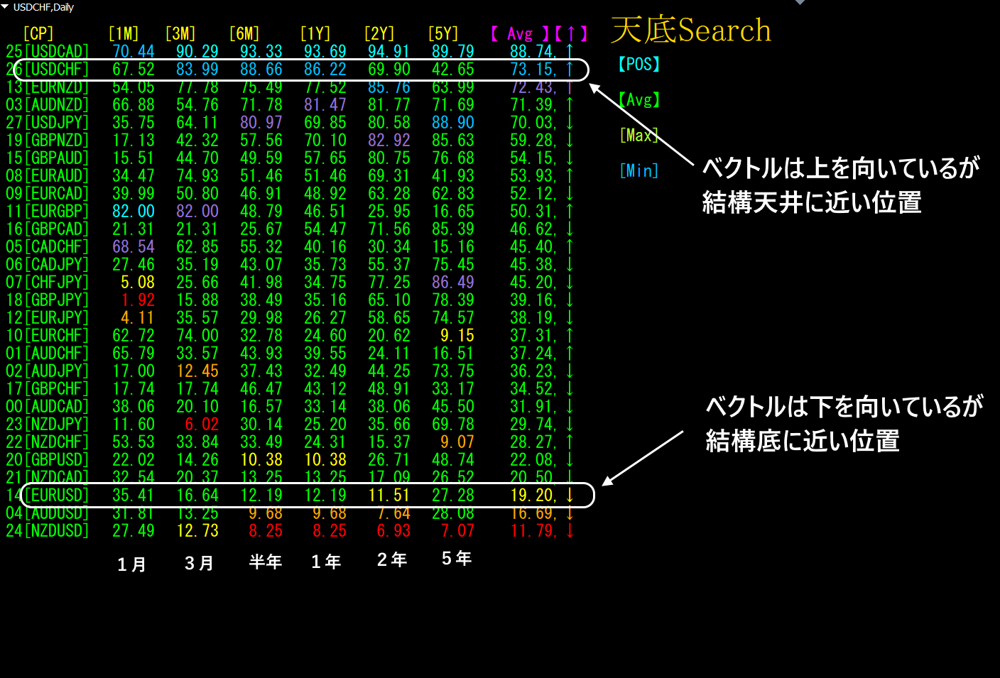 「天底Searchインジケータ」で、USDCHFとEURUSDの天底位置を確認してみます。