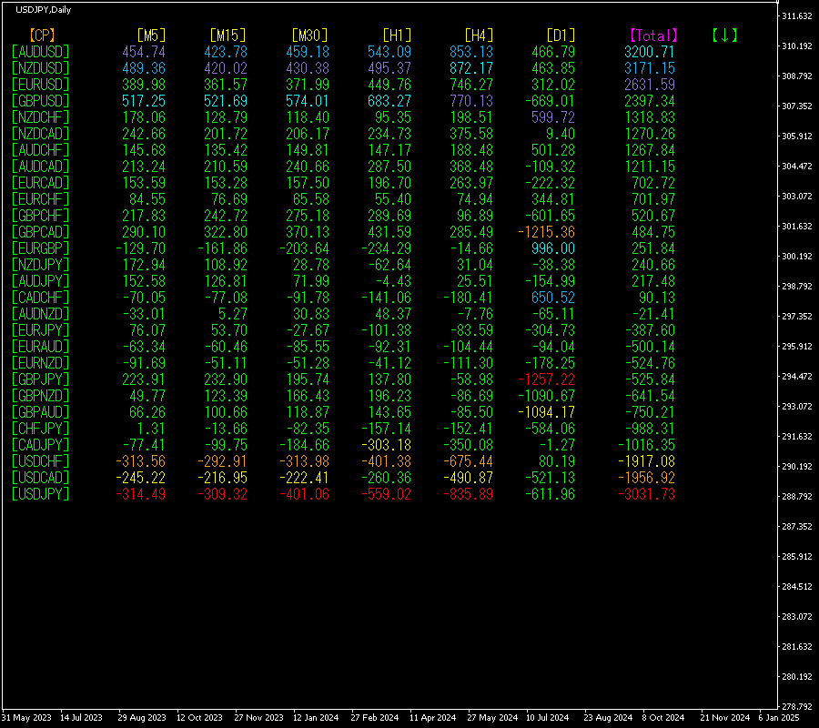 Total]数値の降順に並んでいます。一番下にあるUSDJPYは、D1を除く全ての時間足で赤色になっています。Total数値が -3031.73と、大きなマイナスの数字になっています。USDJPYに下降トレンドが発生していることが示唆されます。