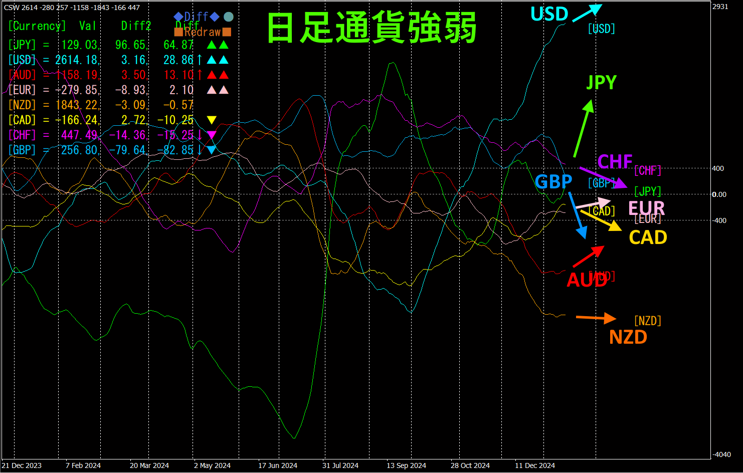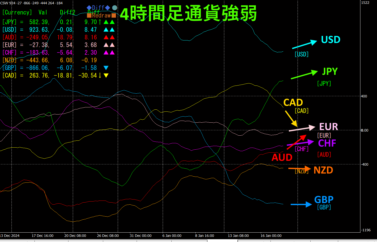 4時間足では、JPY、USD、AUD、EUR、CHFが上向き、CAD、GBP、NZDが下向きになっています。