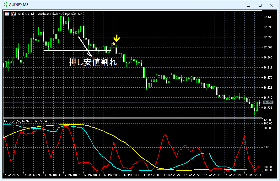 【MT5版】押し安値割れとmBDSR(RCI2本フィルター)の戻り売りサイン 豪ドル円