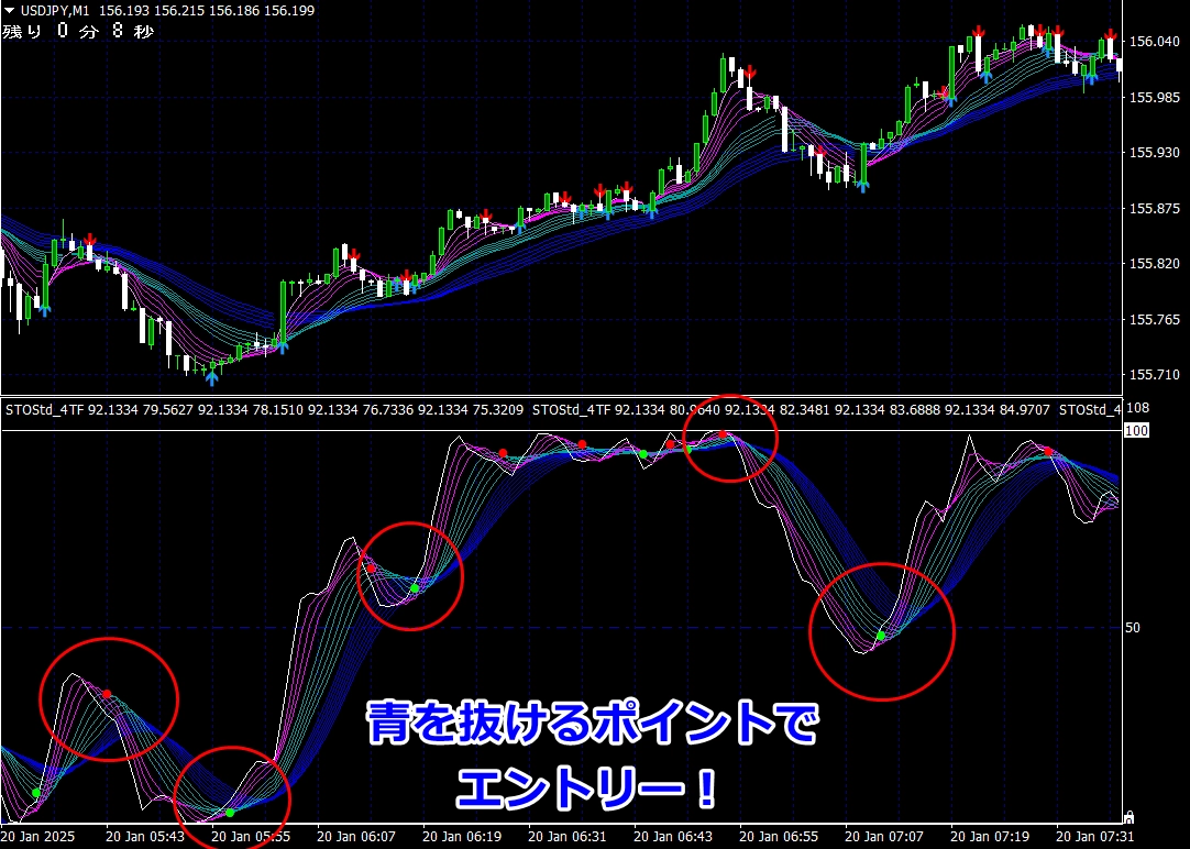 ※ サイン点灯=エントリーではありませんので、インジケーターが緑帯をすくい上げるような形状でない場合は、エントリーしません(サイン点灯でエントリーできる頻度は、数回に1度くらいです)。