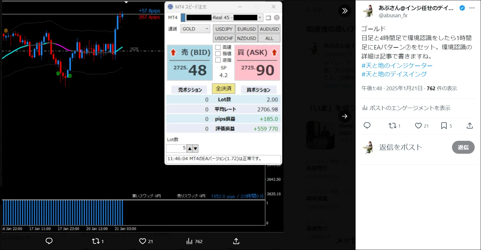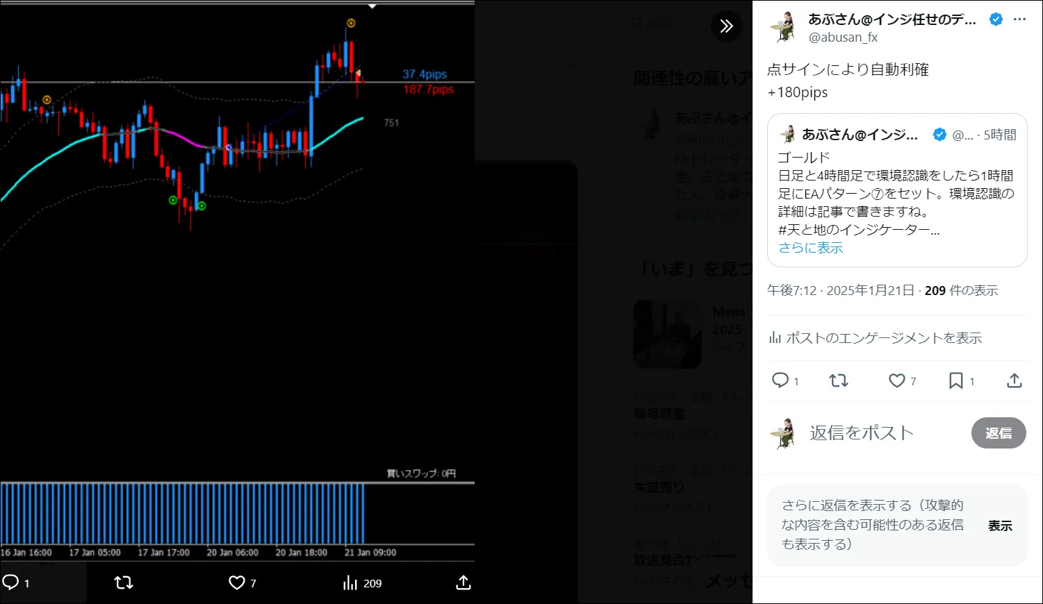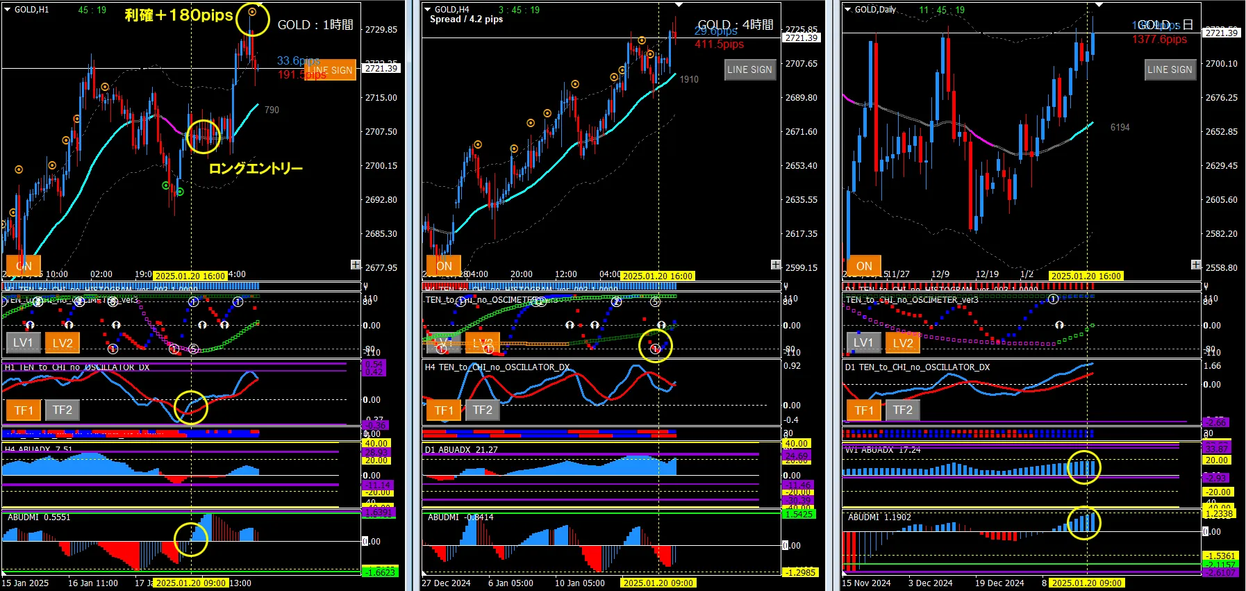 【2025年1月21日】EAパターン⑦で+180pips!天と地のインジケーターのデイスイング手法検証(ゴールド)