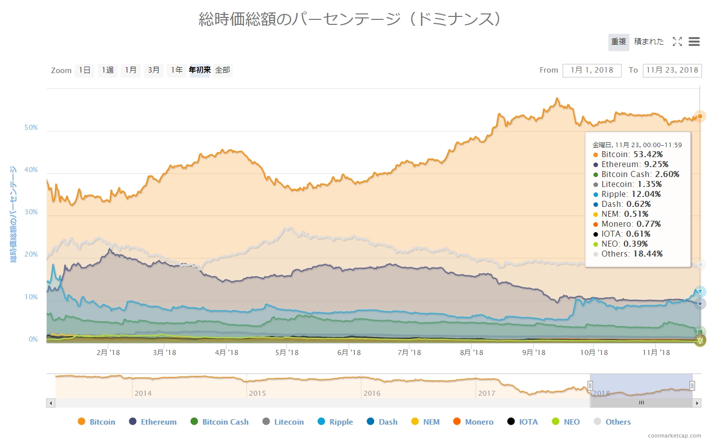 画像は2018年11月23日のキャプチャ。昨日は調整的な3~5%の動きで「緑」が目立っていましたが、今日は下げトレンドに回帰して「真紅」に染まっています。ビットコインキャッシュは13%の下落、その他主要銘柄も6~10%の値崩れを起こしています。