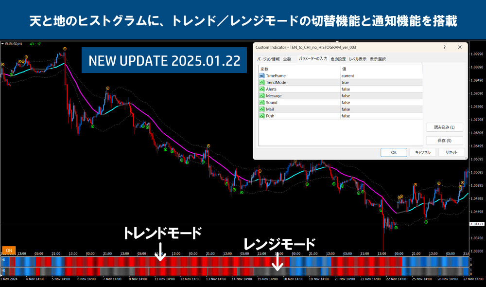「天と地のインジケーター」最新版 ver 10.01では標準装備の「天と地のヒストグラム」に、トレンド、レンジモードの切替機能と通知機能を搭載いたしました。