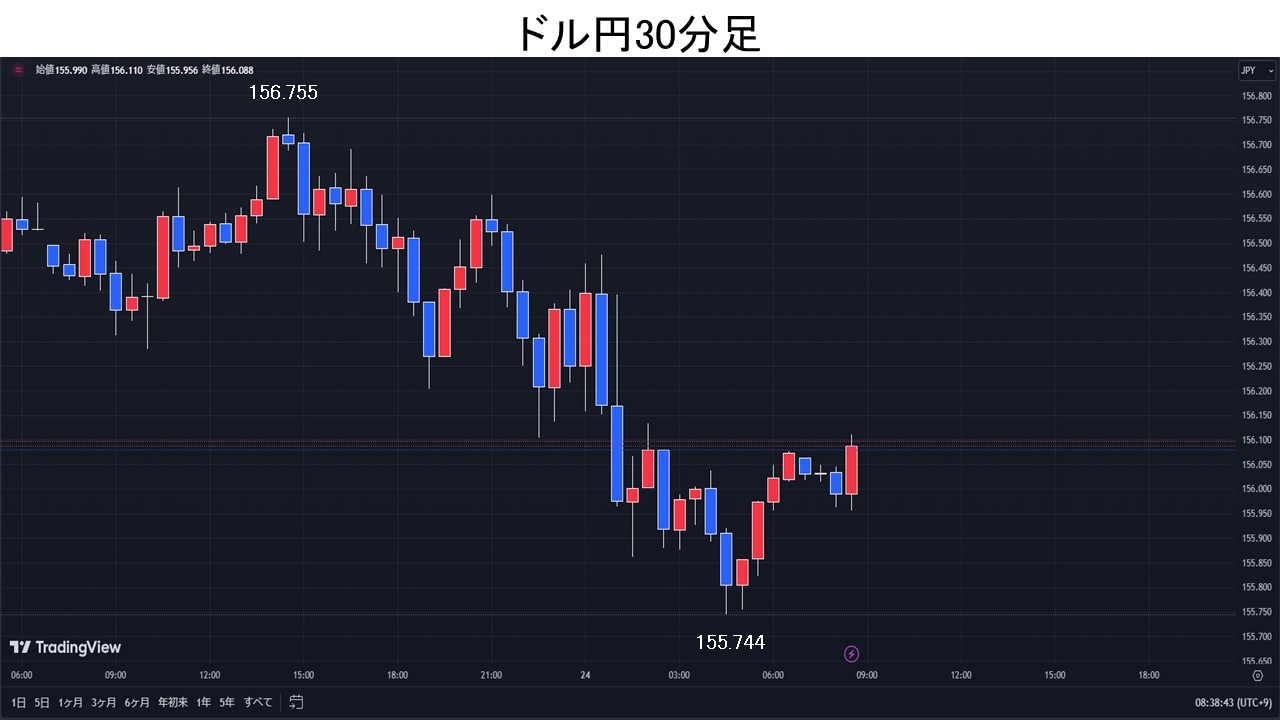 東京時間、ドル円は、日経平均の上昇などを受け、リスク・オンの流れで156.75円まで上昇。欧州時間、ダボス会議でのトランプ米大統領演説や日銀金融政策決定会合(1/23-24)を控え156円台半ばで小動き。NY時間、前週分の米新規失業保険申請件数が22.3万件(予想22.0万件)となると、円買い・ドル売りが先行。ダボス会議でトランプ米大統領が「すぐに金利を下げるよう要請するつもりだ。そして世界中で金利は下がるべきだ」と述べると、全般ドル売りが先行し、ドル円は155.74円まで下落。