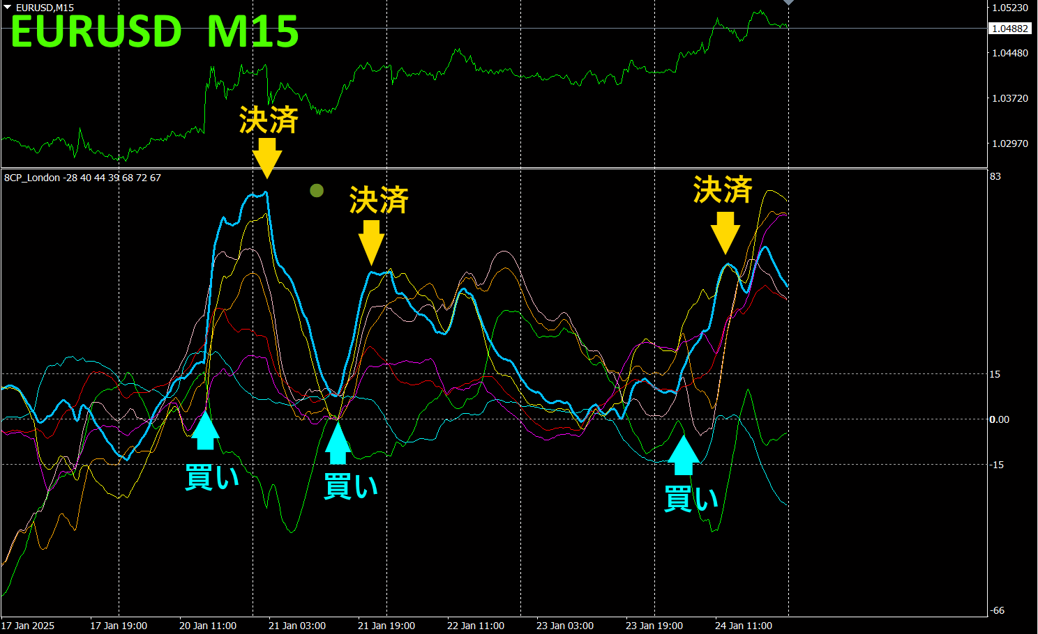 上半分は、EURUSDの15分足チャートです。下半分は、「8CP見える化インジータ」によるものです、水色太線のグラフがEURUSDに相当します。