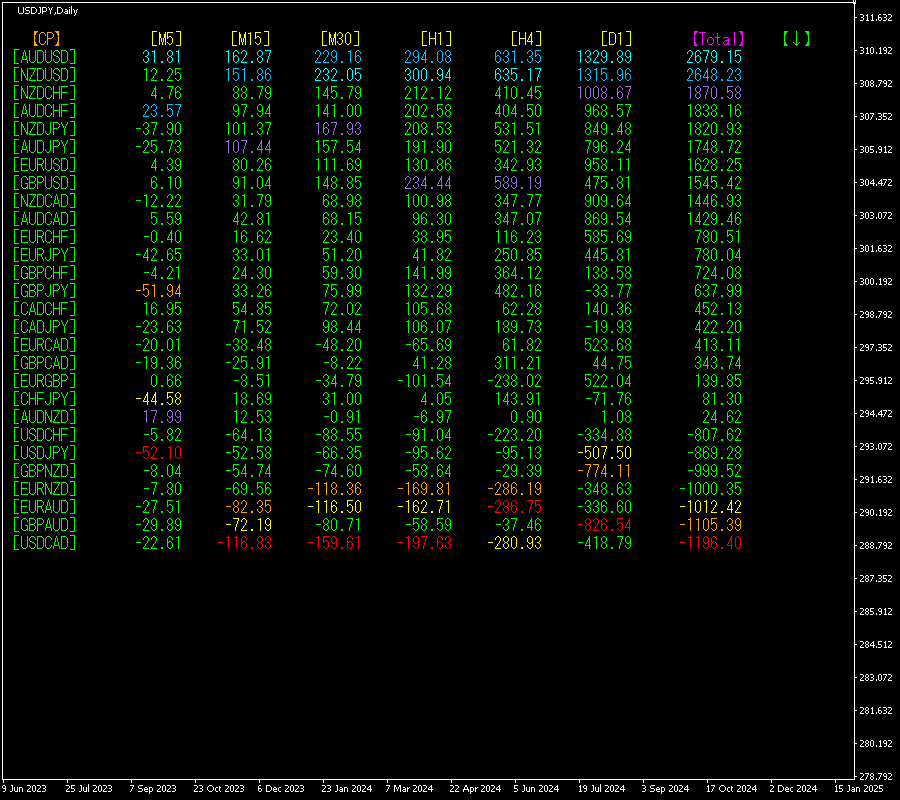 Total]数値の降順に並んでいます。一番上にあるAUDUSDは、全ての時間足で青色系の表示色になっています。Total数値が 2679.15と、大きなプラスの数字になっています。AUDUSDに上昇トレンドが発生していることが示唆されます。