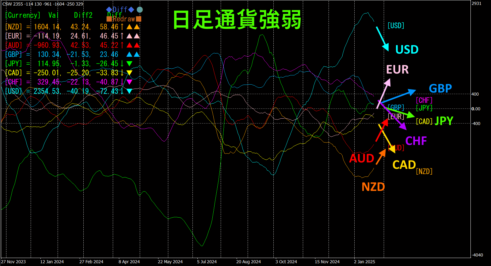 NZD、EUR、AUD、GBPが上向きです。一方、USD、CHF、CAD、NZD、JPYが下向きになっています。日足通貨強弱チャートでは、NZDの急角度な上昇とUSDの急下降が目立っています。