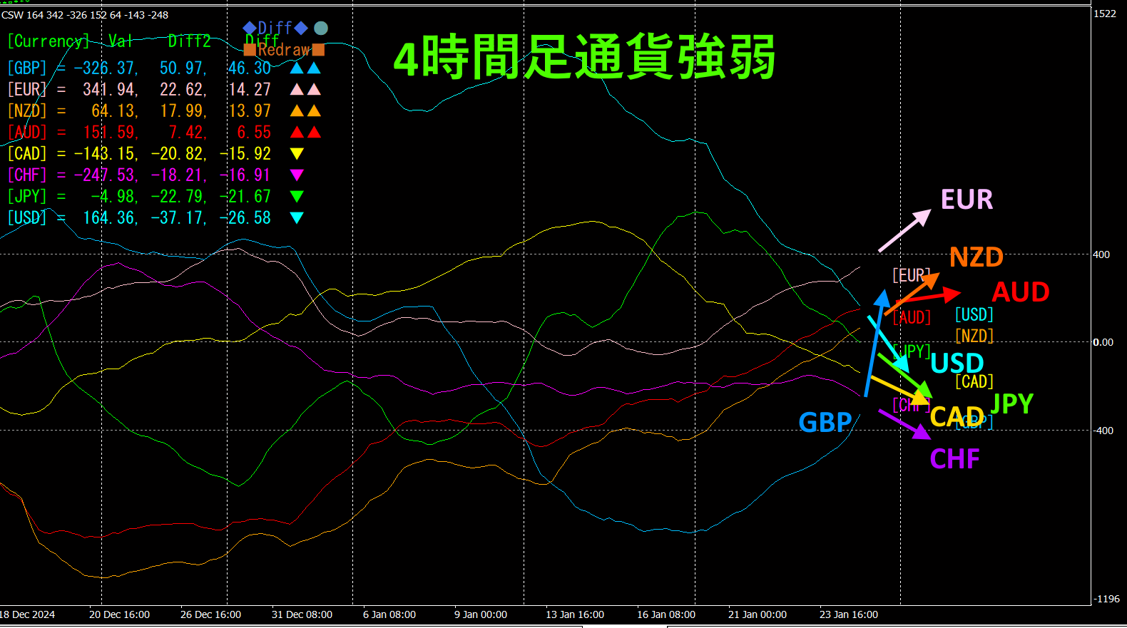 4時間足では、GBP、EUR、NZD、AUDが上向き、USD、JPY、CHF、CADが下向きになっています。
