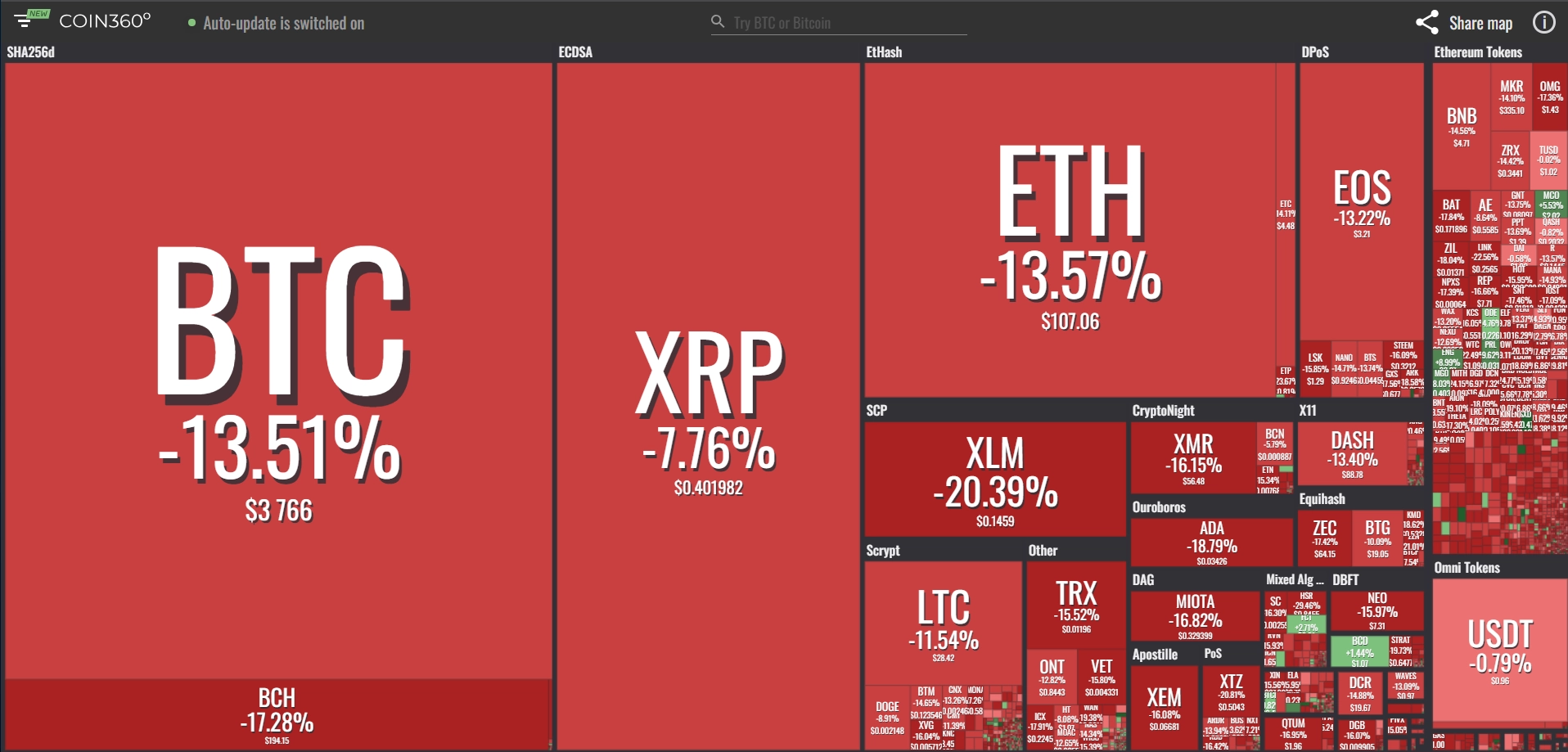 coinmarketcap(コインマーケットキャップ)のサイトから、ドミナンス(各銘柄が仮想通貨全体の時価総額に占めるパーセンテージ)を定点観測していきます。仮想通貨全般が下方向に大きく動き出している相場状況を受け、毎日更新することとし、仮想通貨業界を俯瞰および転換期を早期に発見することを目的とします。