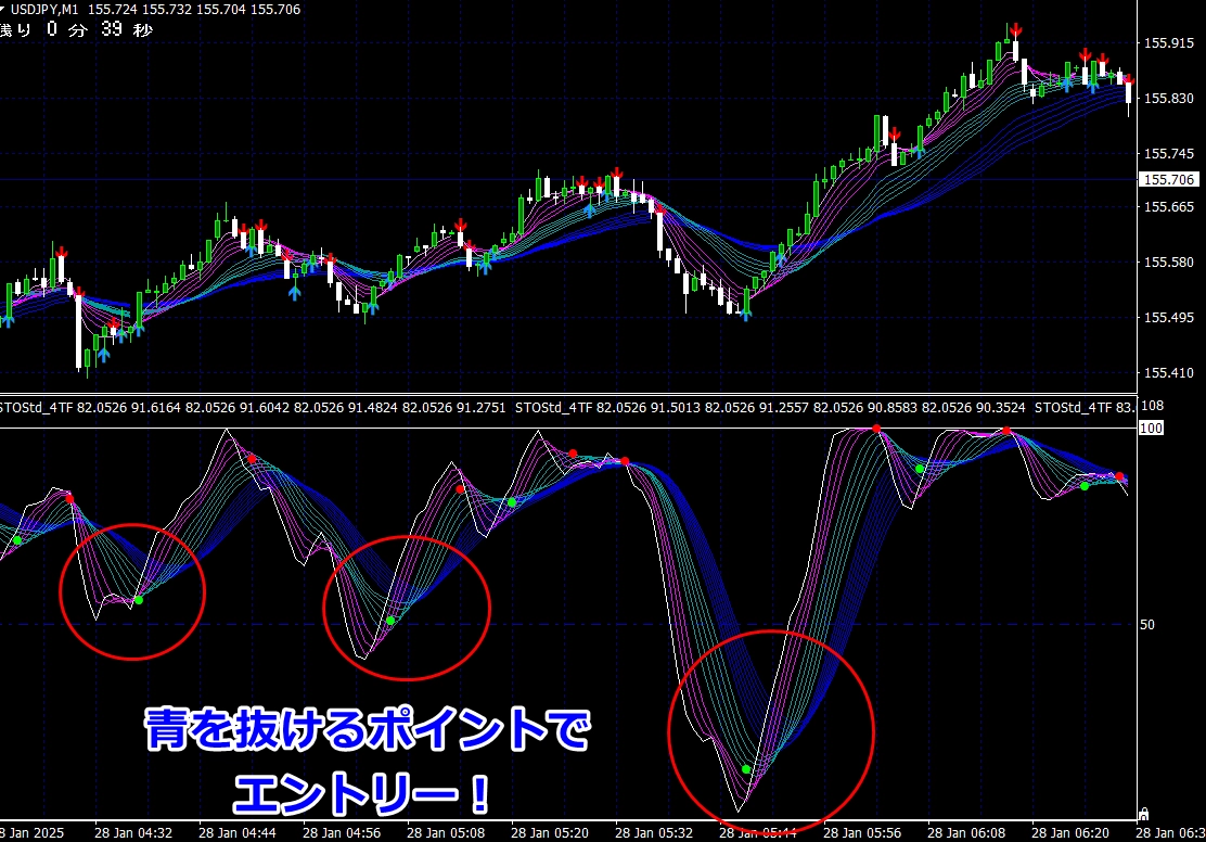 ※ サイン点灯=エントリーではありませんので、インジケーターが緑帯をすくい上げるような形状でない場合は、エントリーしません(サイン点灯でエントリーできる頻度は、数回に1度くらいです)。