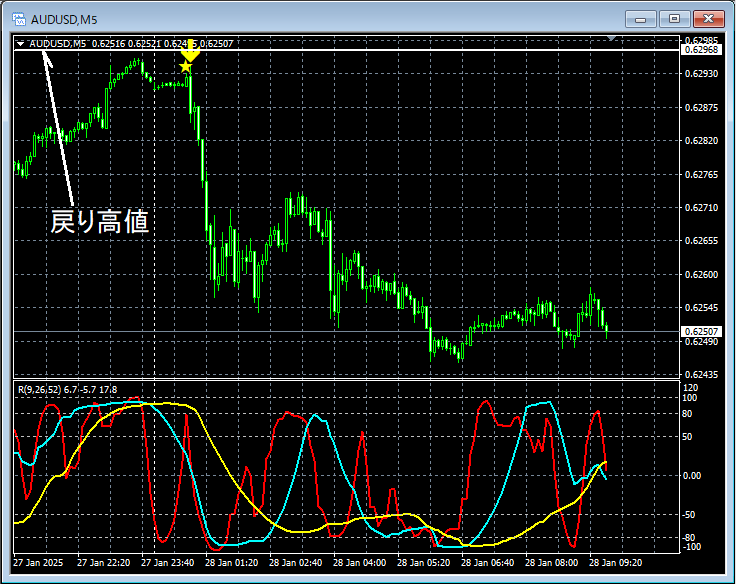この例から、戻り高値(ダウ理論)に注目したトレード手法とmBDSRのサインとの親和性の高さがうかがえる。