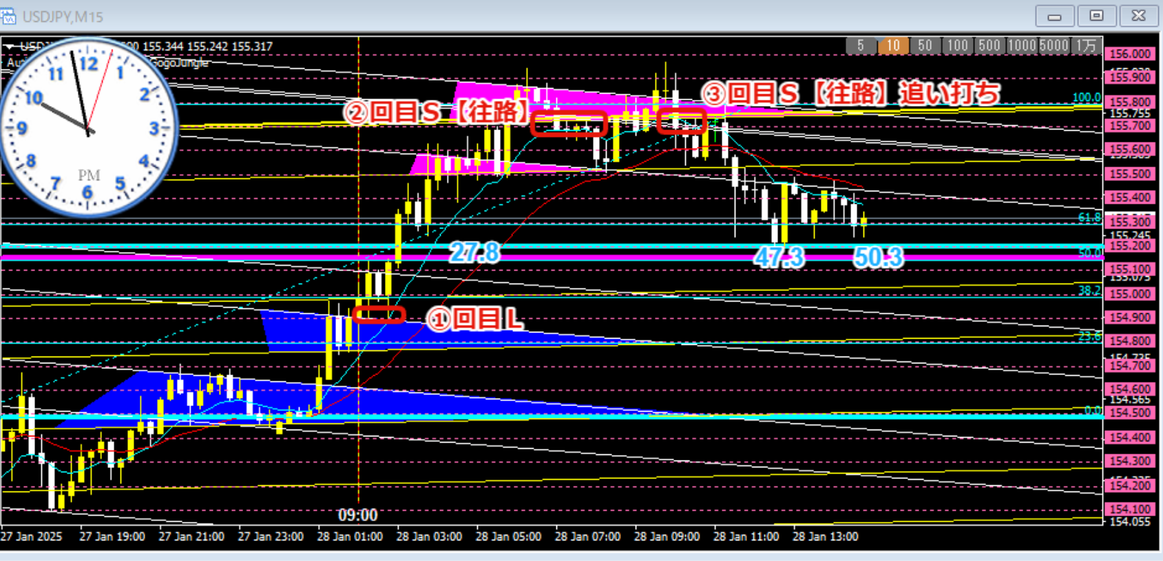 上図の①回目L(ロング)が往路の初回のトレードです。