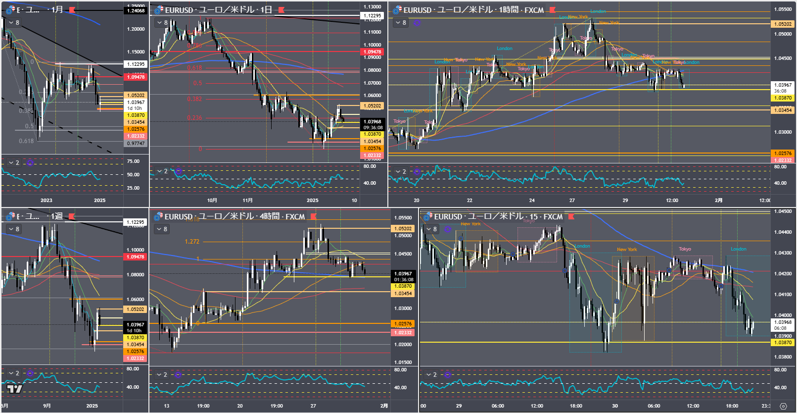 テクニカル分析では月足~15分足を主に分析します。使用するテクニカルは水平・チャネル・トレンドライン、移動平均線(10、20、50、100、200SMA、日足以上だけ5SMAを表示)、フィボナッチ(リトレースメント、エクスパンション)です。