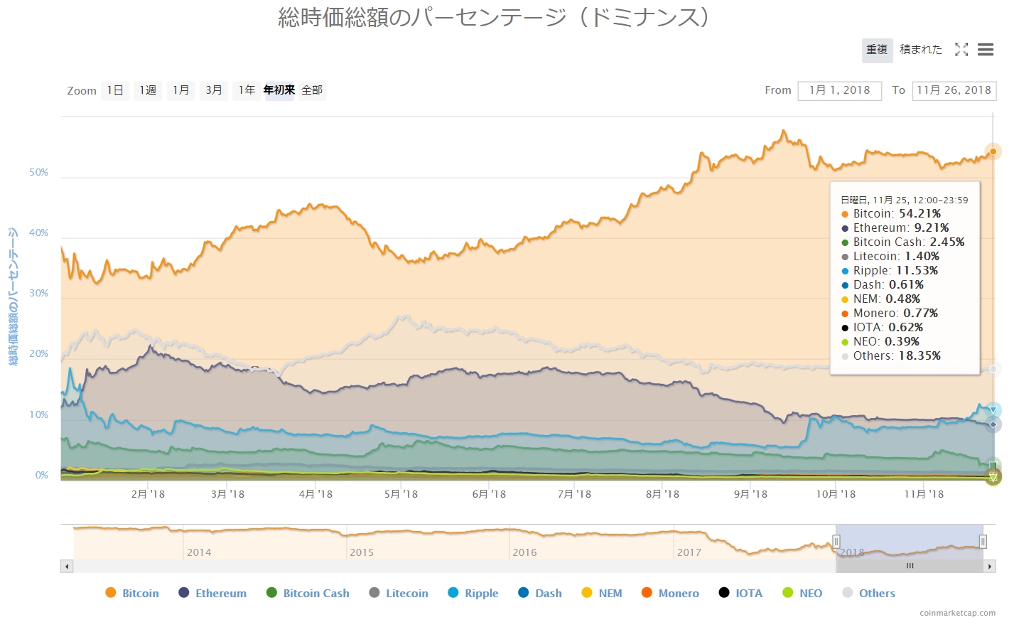 画像は2018年11月27日のキャプチャ。調整の次には再下落が来る。そんなリズムが繰り返されています。機能の調整から一転、大幅下落の様相となりました。ビットコイン、リップル、イーサリアムは6~8%の下落です。