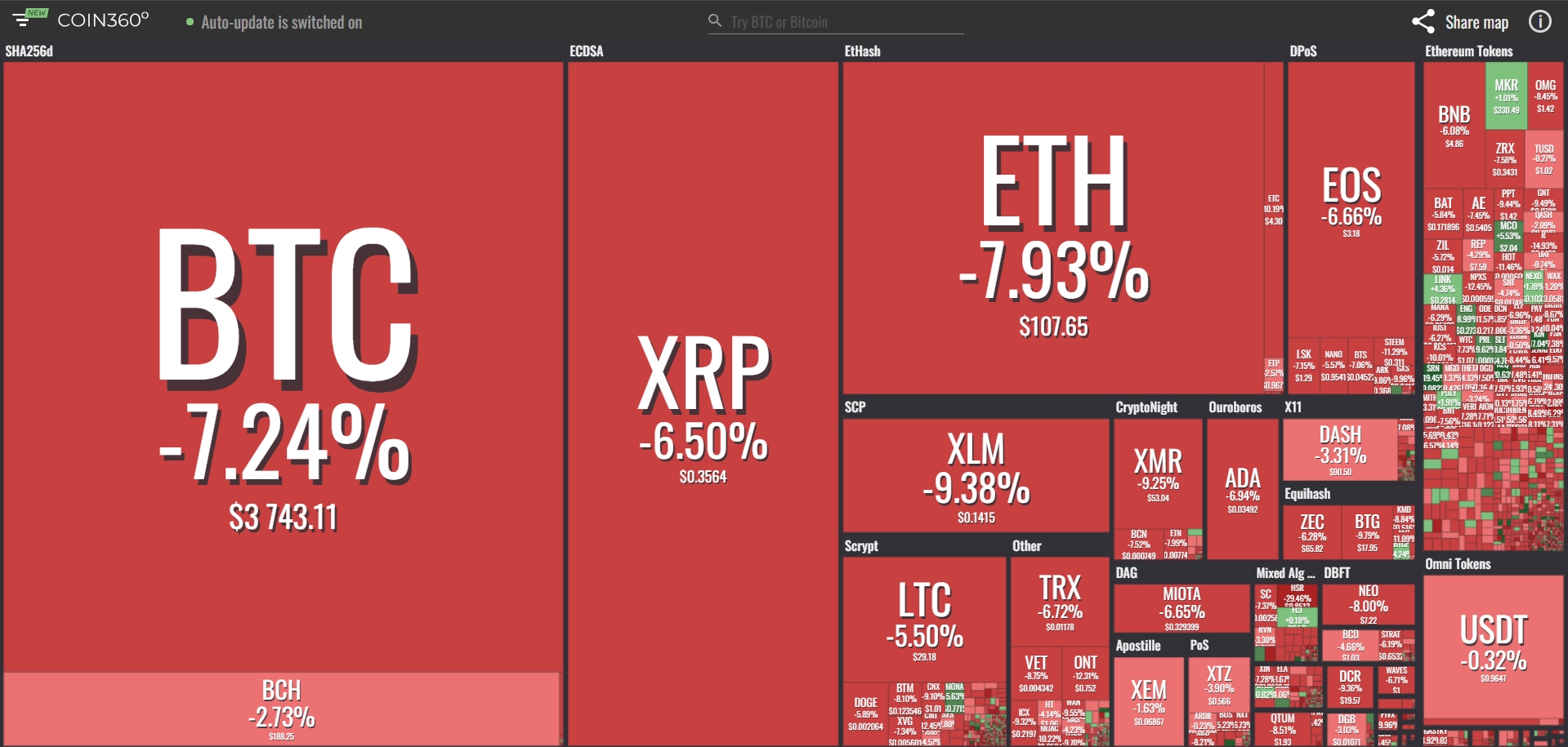 coinmarketcap(コインマーケットキャップ)のサイトから、ドミナンス(各銘柄が仮想通貨全体の時価総額に占めるパーセンテージ)を定点観測していきます。仮想通貨全般が下方向に大きく動き出している相場状況を受け、毎日更新することとし、仮想通貨業界を俯瞰および転換期を早期に発見することを目的とします。