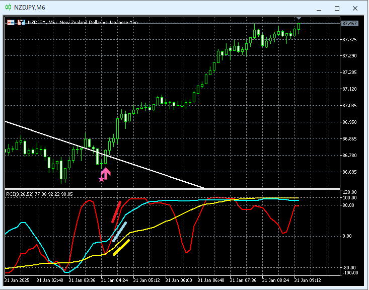 その直後に、再度カウンタートレンドラインを上抜けして、RCI3本ラインはそろって上昇のとても強い形となり、プライスは大きく上昇している。