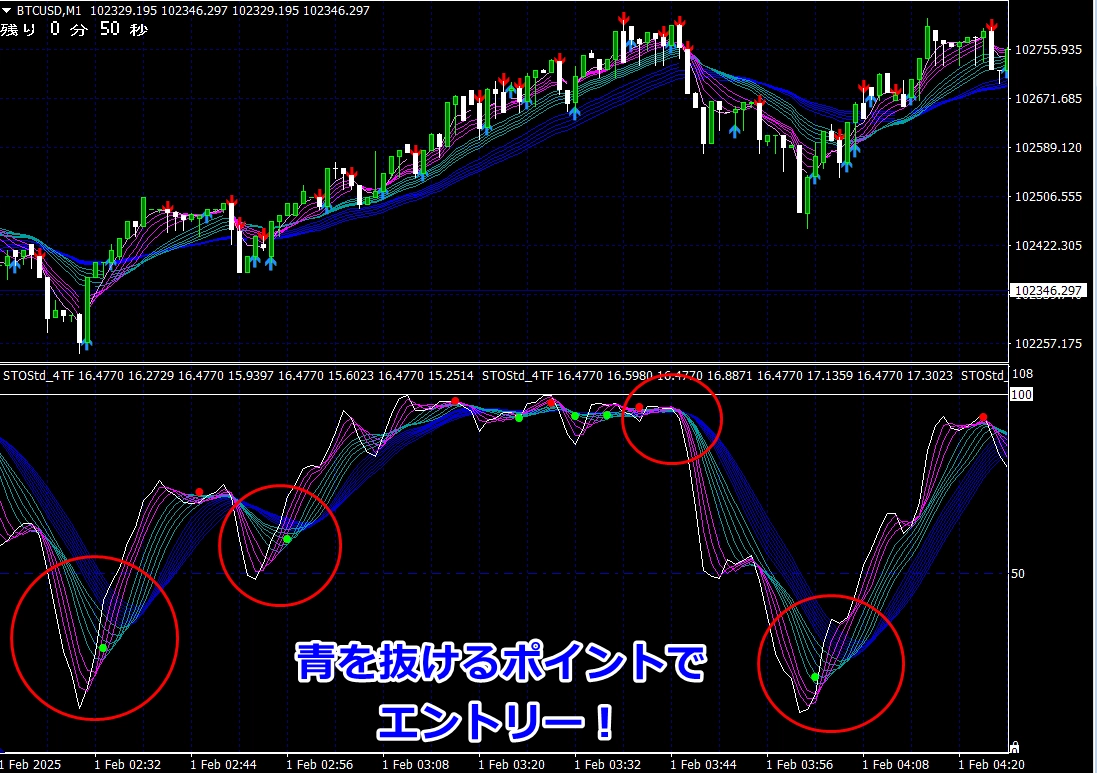 ② 矢印サイン点灯状態で、インジケーターのピンク色の帯が、緑の帯を下からすくい上げるような形状であれば、現在のローソク足が確定する数秒前か確定の直後に1分判定または3分判定でハイエントリーします。