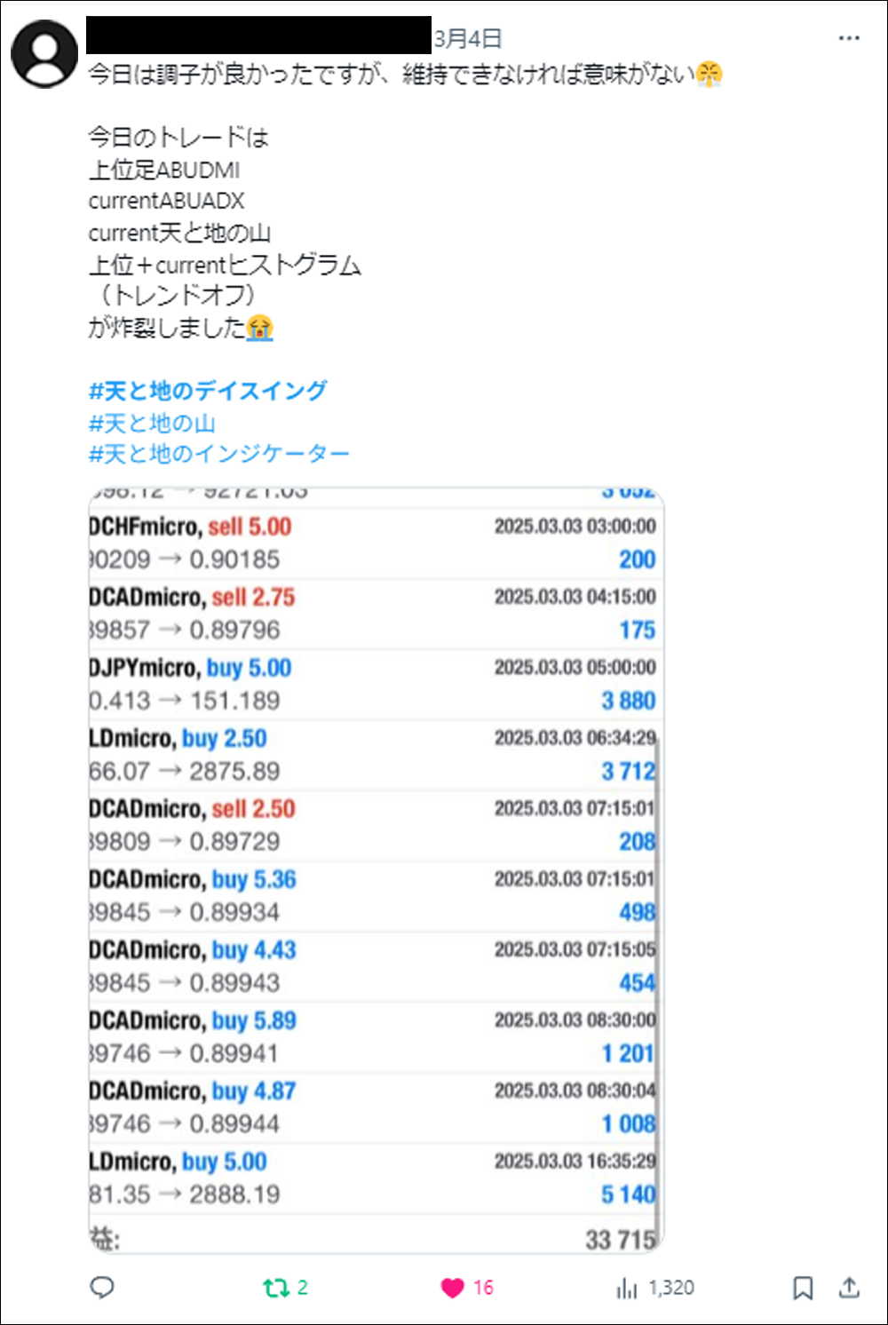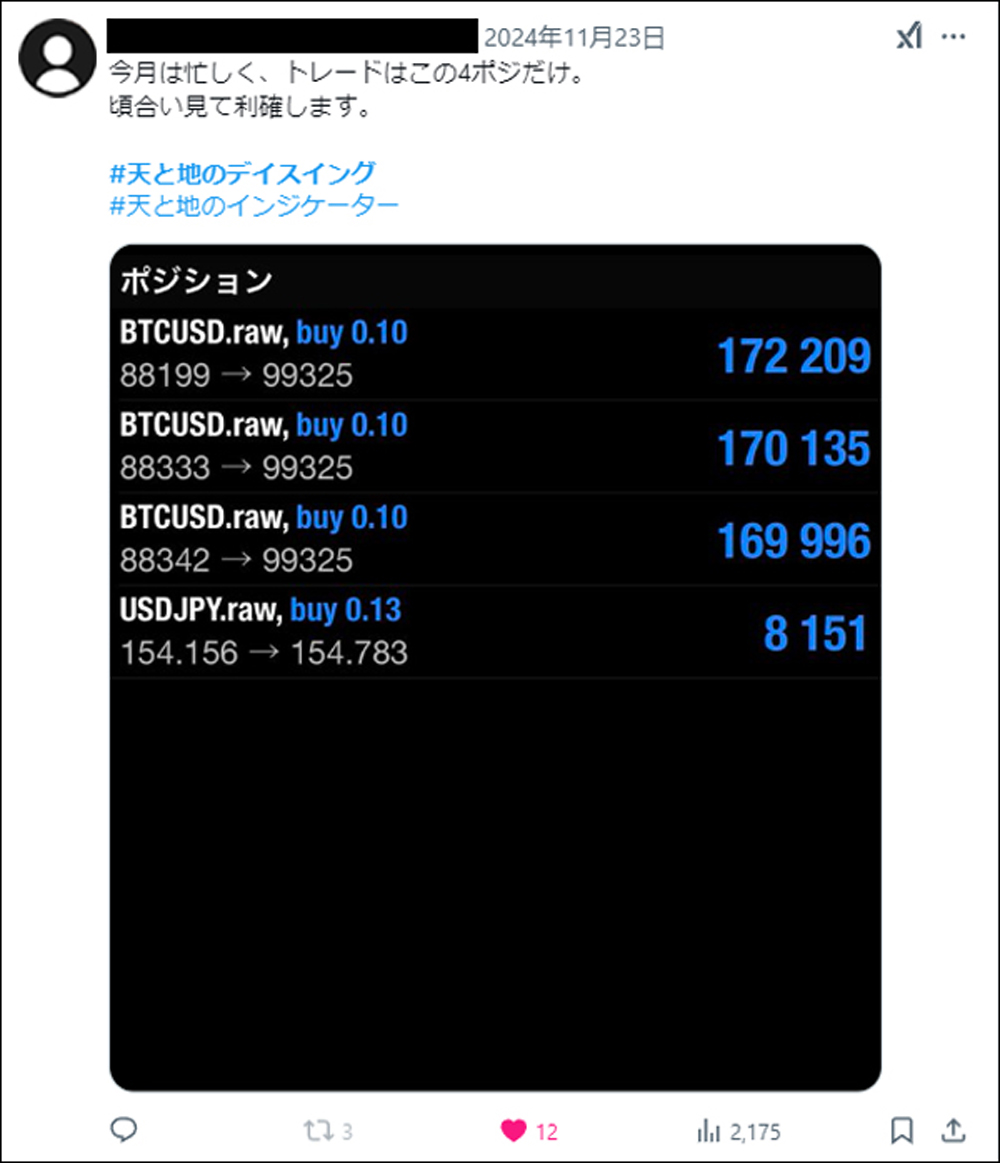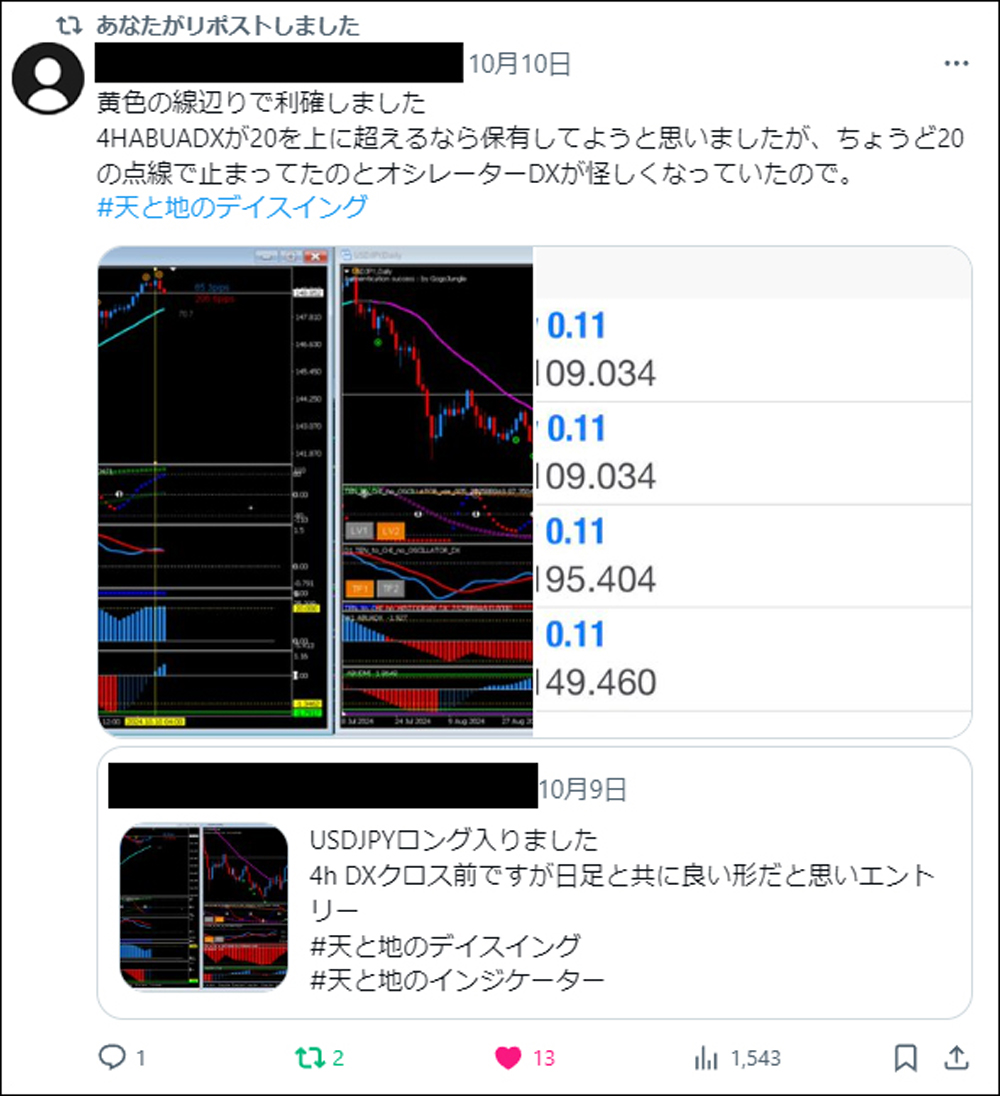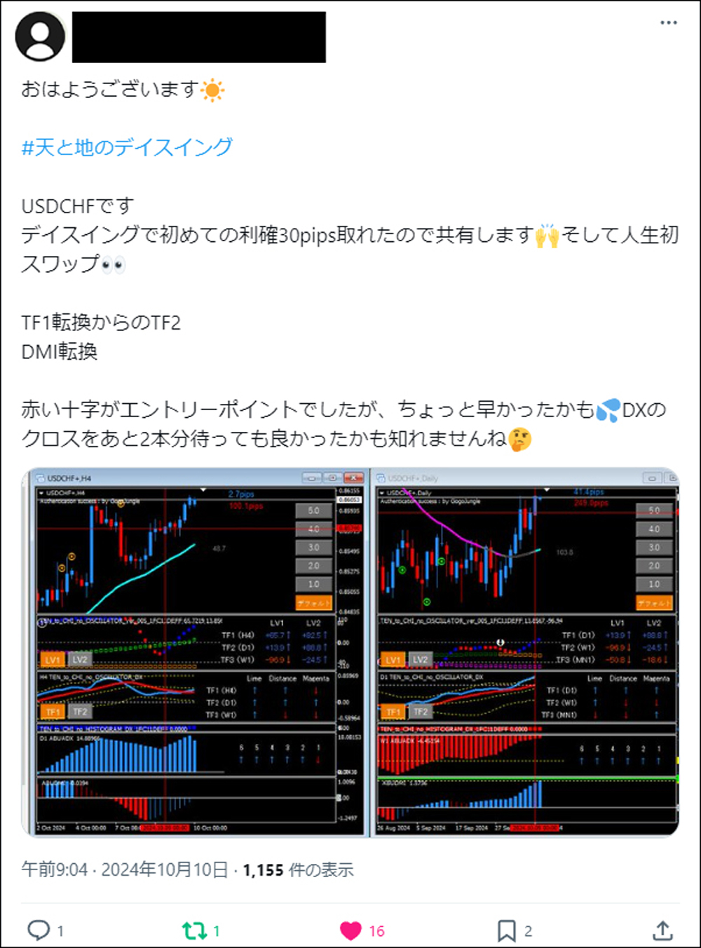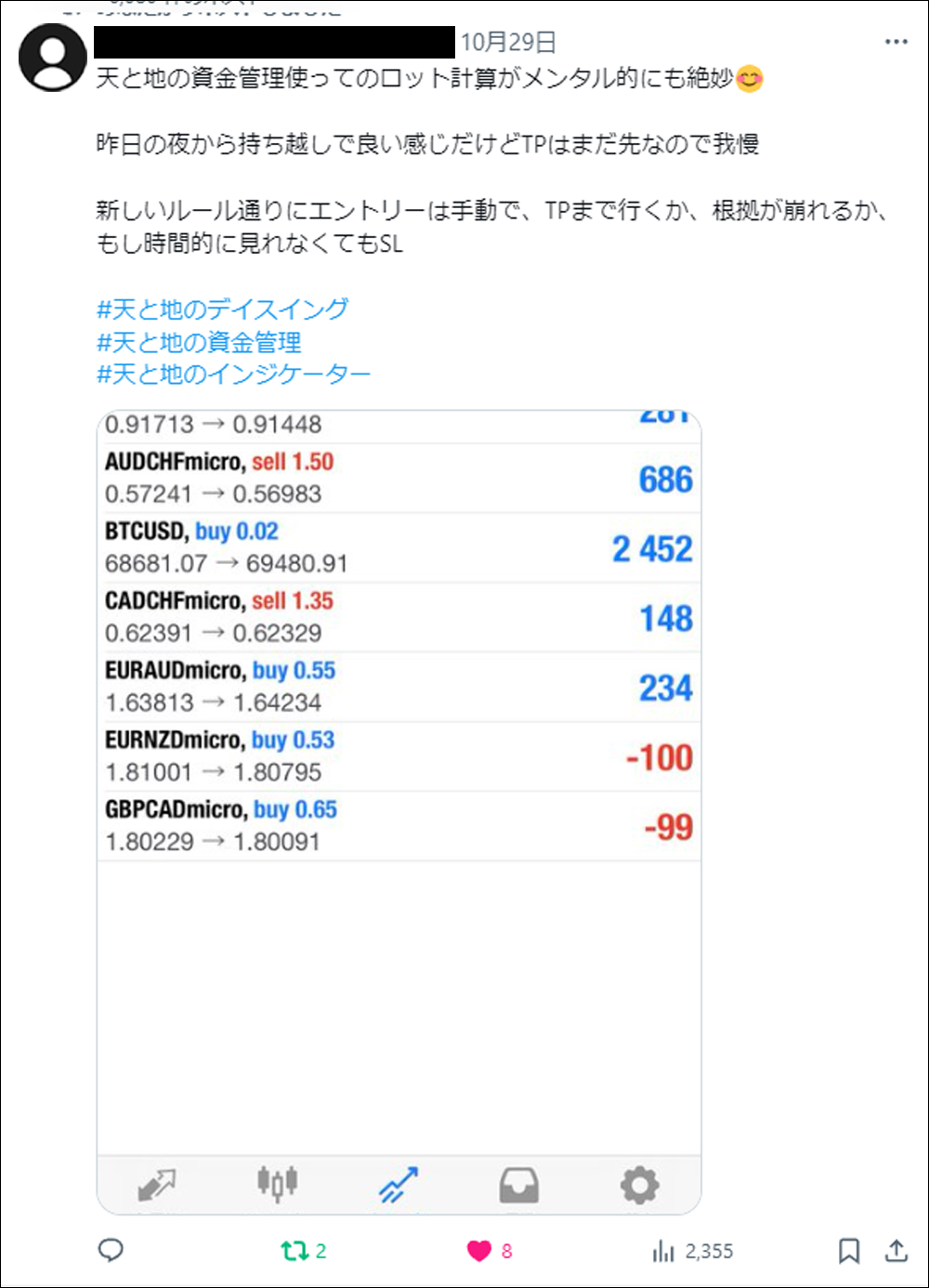 トレードで勝ち続ける秘訣は「手法を信じる事」です。この信じる気持ちが、ポジションを持ち続ける際のメンタルに大きく関わってきます。ユーザー様からのポストをこのようにご紹介する理由の一つに「本ツールのトレード手法を使って成功されている方が数えきれない程いる」という紛れもない事実を皆様にご認識していただきたいという事がございます。是非最後まで読んでいただけますと幸いです。