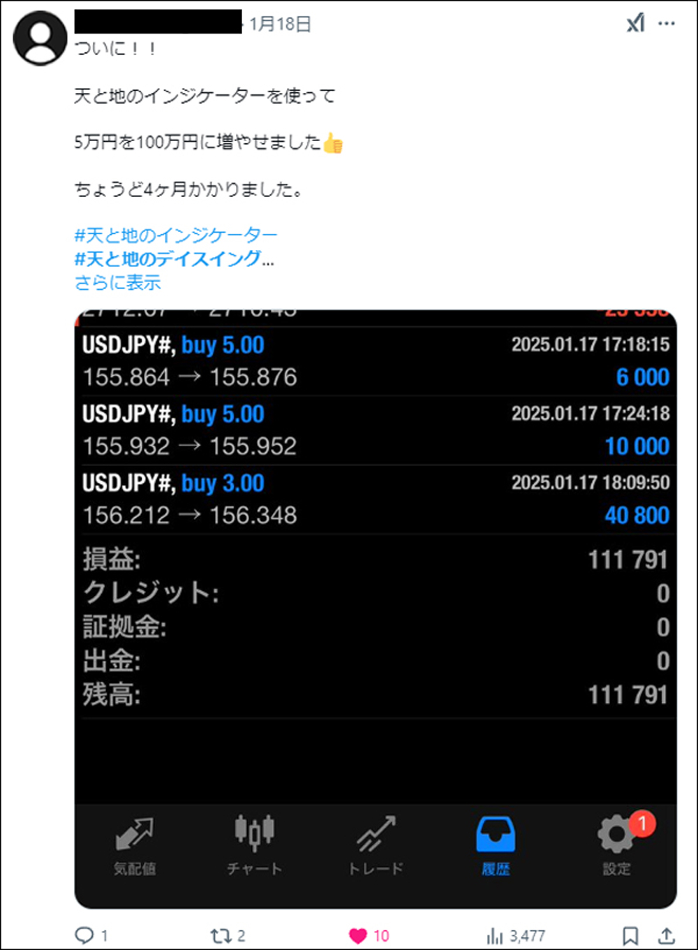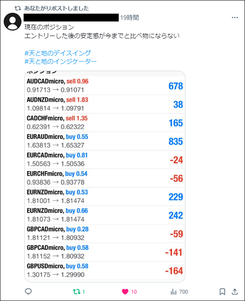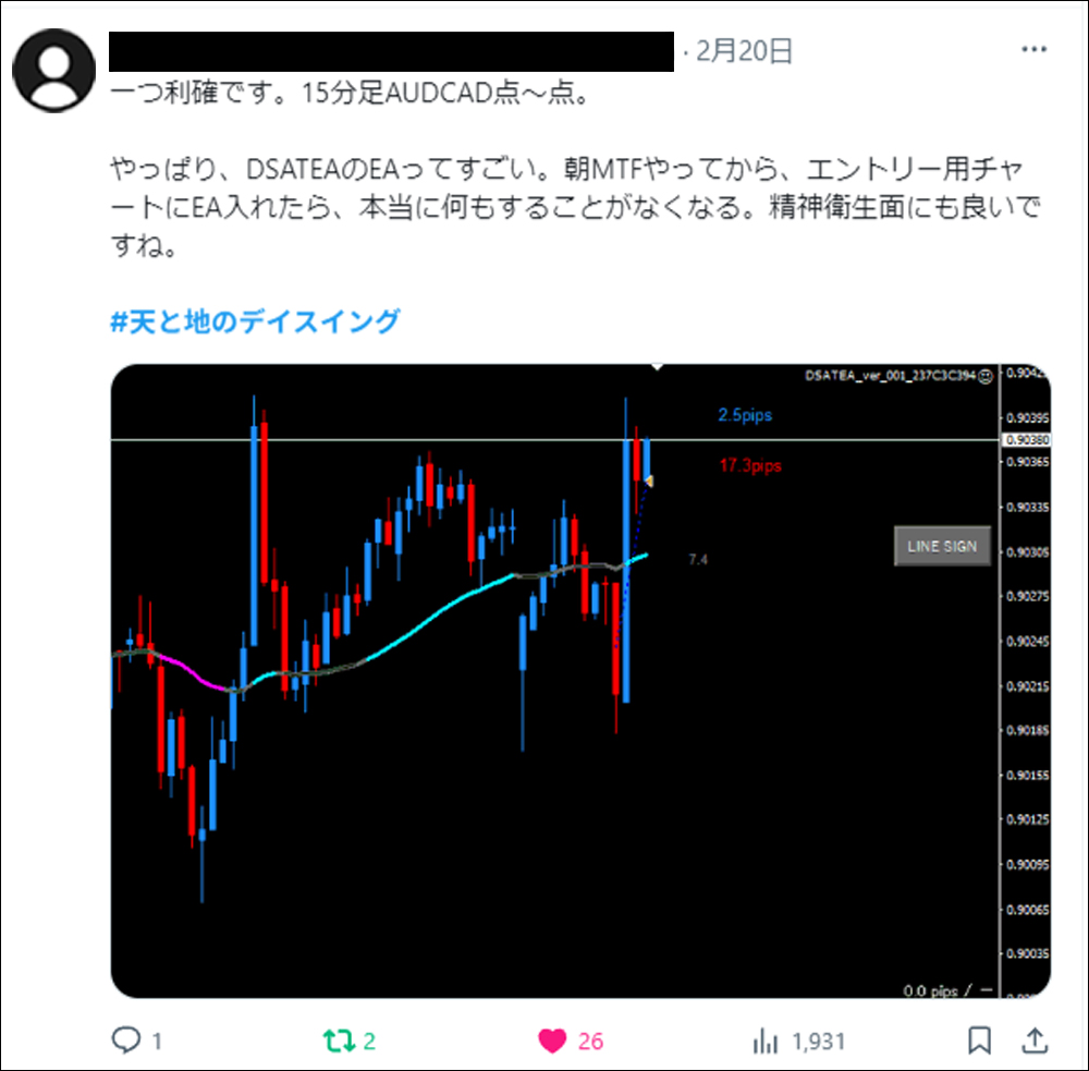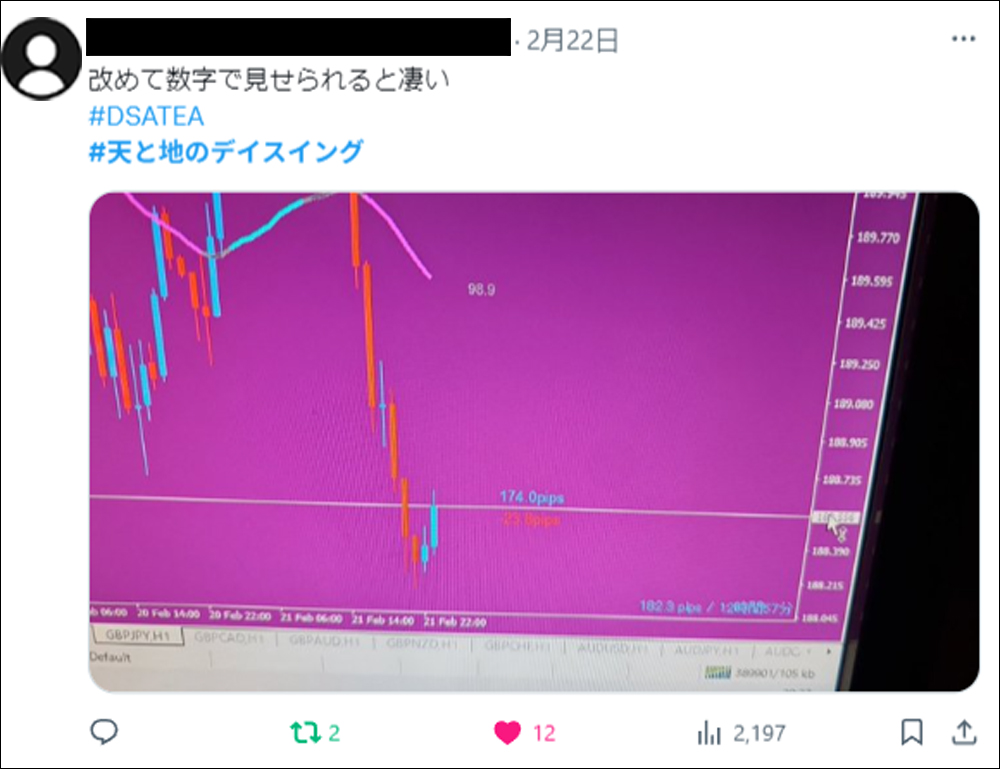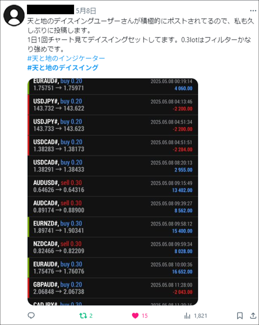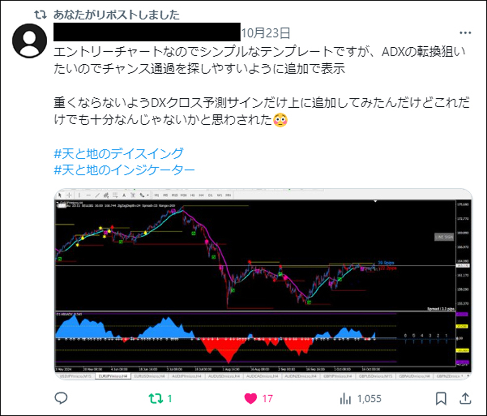 トレードで勝ち続ける秘訣は「手法を信じる事」です。この信じる気持ちが、ポジションを持ち続ける際のメンタルに大きく関わってきます。ユーザー様からのポストをこのようにご紹介する理由の一つに「本ツールのトレード手法を使って成功されている方が数えきれない程いる」という紛れもない事実を皆様にご認識していただきたいという事がございます。是非最後まで読んでいただけますと幸いです。