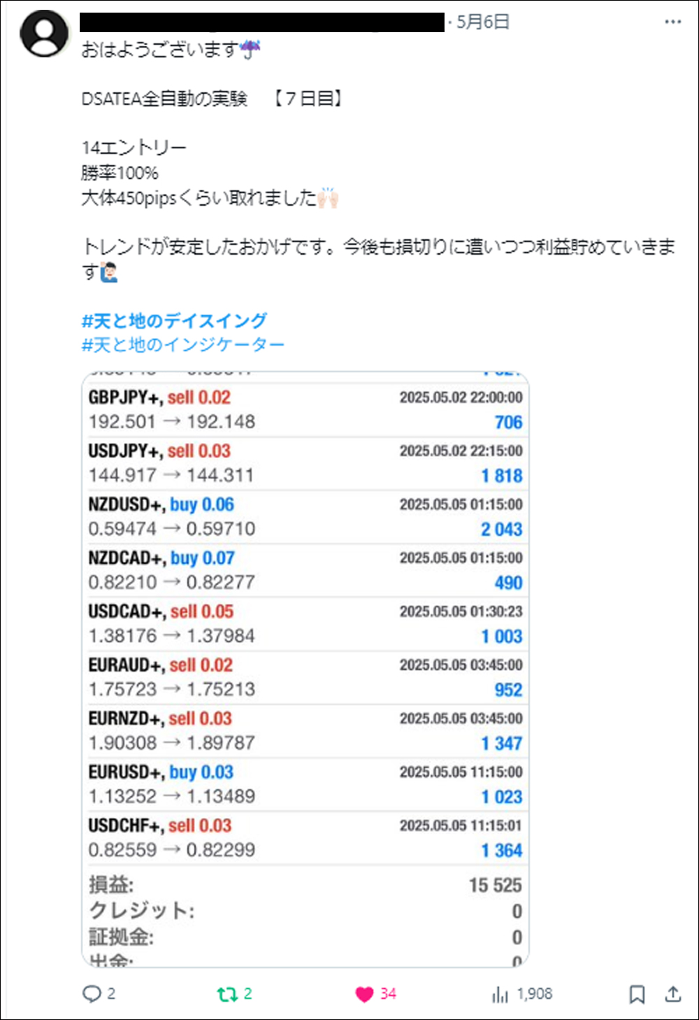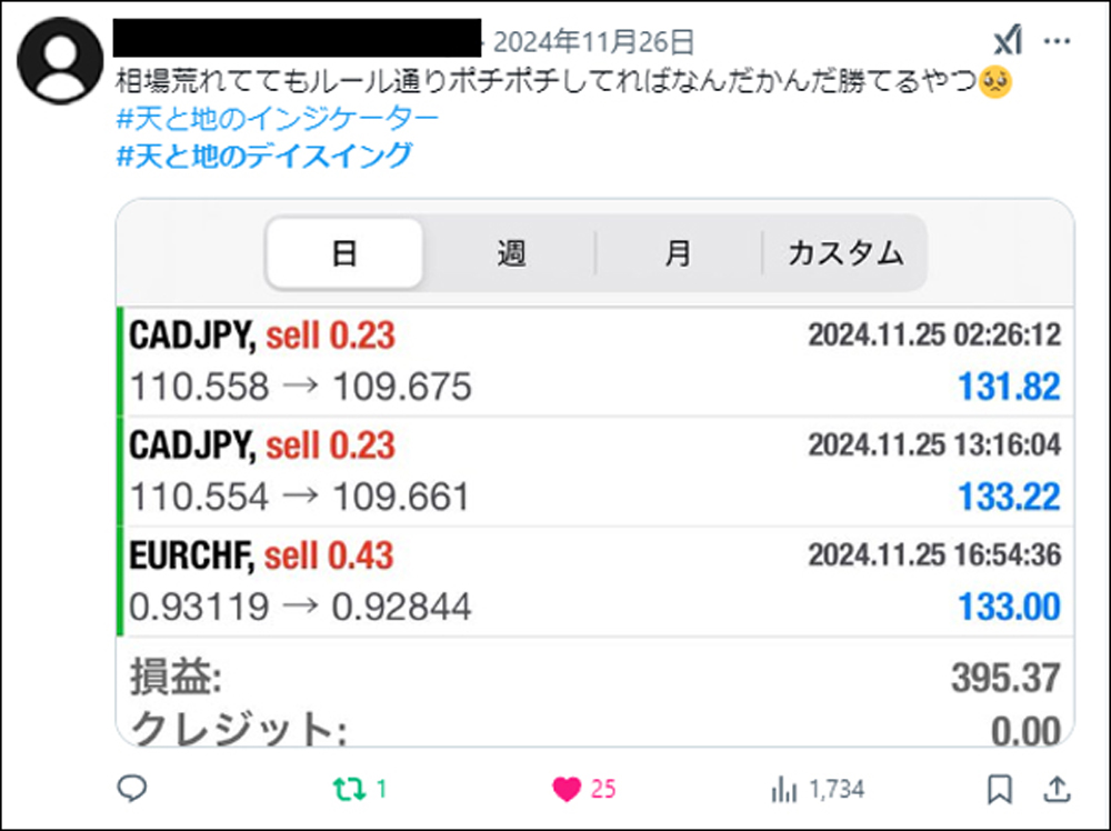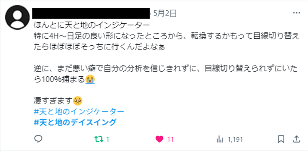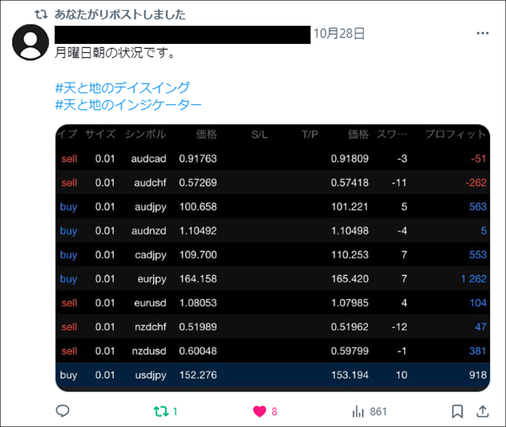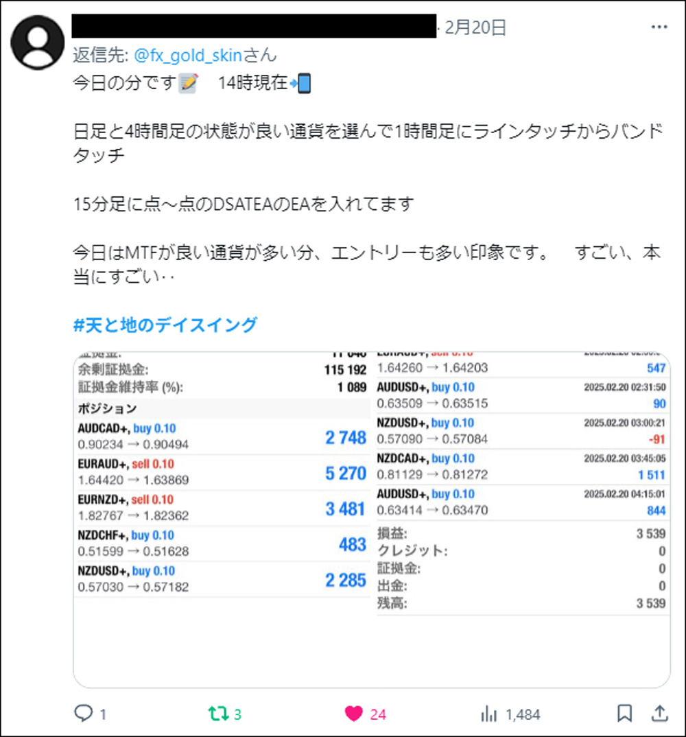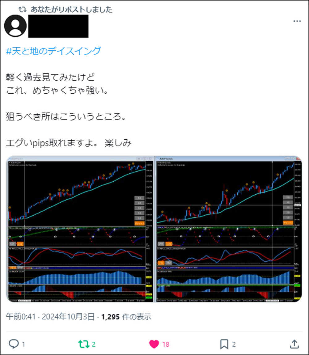 トレードで勝ち続ける秘訣は「手法を信じる事」です。この信じる気持ちが、ポジションを持ち続ける際のメンタルに大きく関わってきます。ユーザー様からのポストをこのようにご紹介する理由の一つに「本ツールのトレード手法を使って成功されている方が数えきれない程いる」という紛れもない事実を皆様にご認識していただきたいという事がございます。是非最後まで読んでいただけますと幸いです。