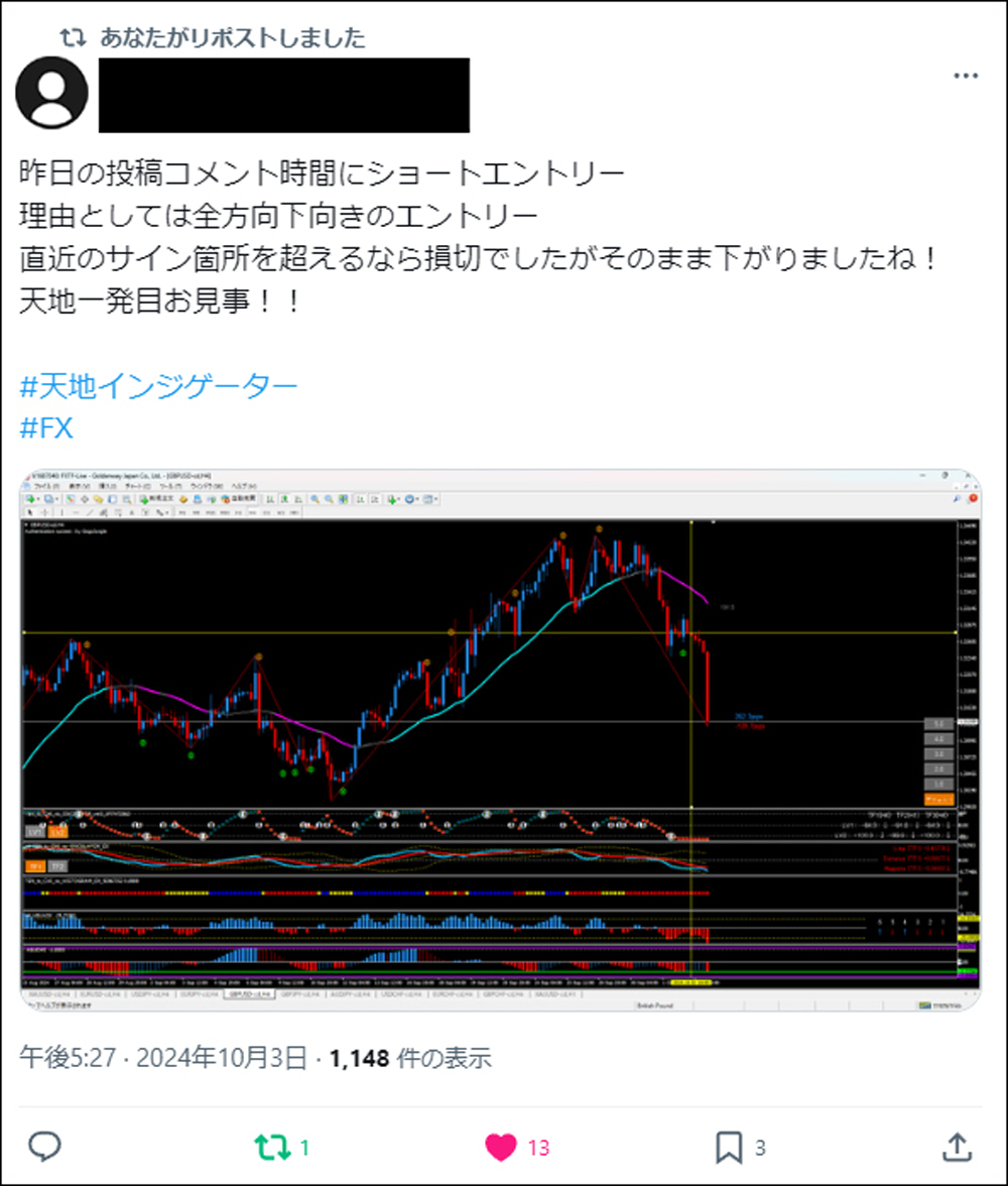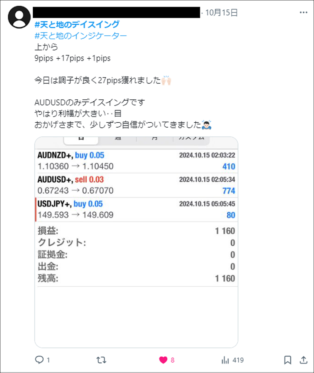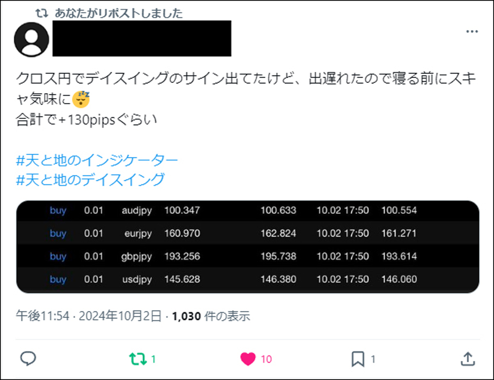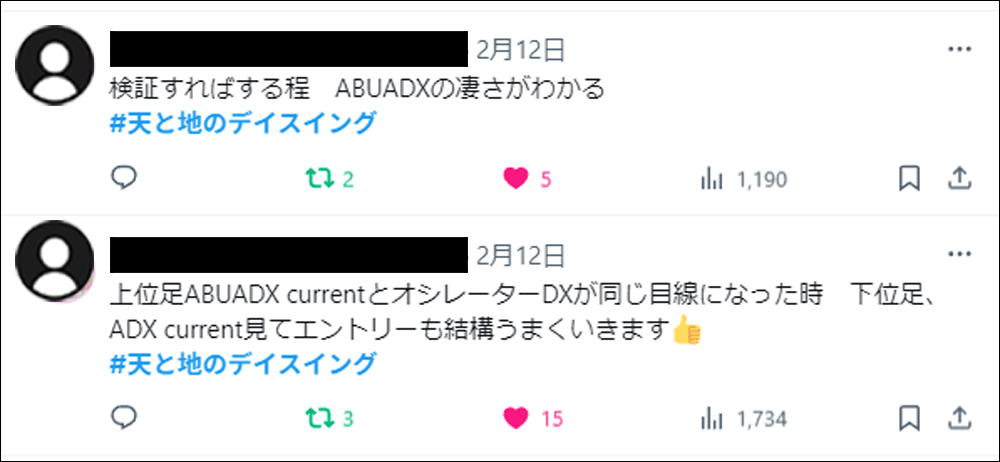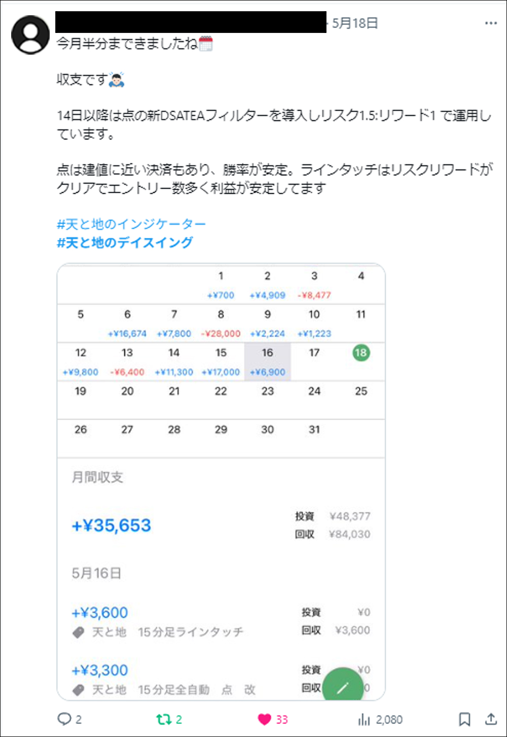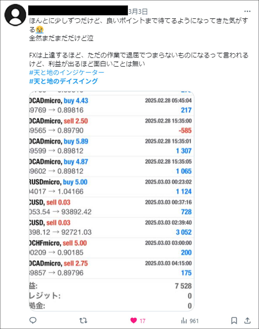 トレードで勝ち続ける秘訣は「手法を信じる事」です。この信じる気持ちが、ポジションを持ち続ける際のメンタルに大きく関わってきます。ユーザー様からのポストをこのようにご紹介する理由の一つに「本ツールのトレード手法を使って成功されている方が数えきれない程いる」という紛れもない事実を皆様にご認識していただきたいという事がございます。是非最後まで読んでいただけますと幸いです。
