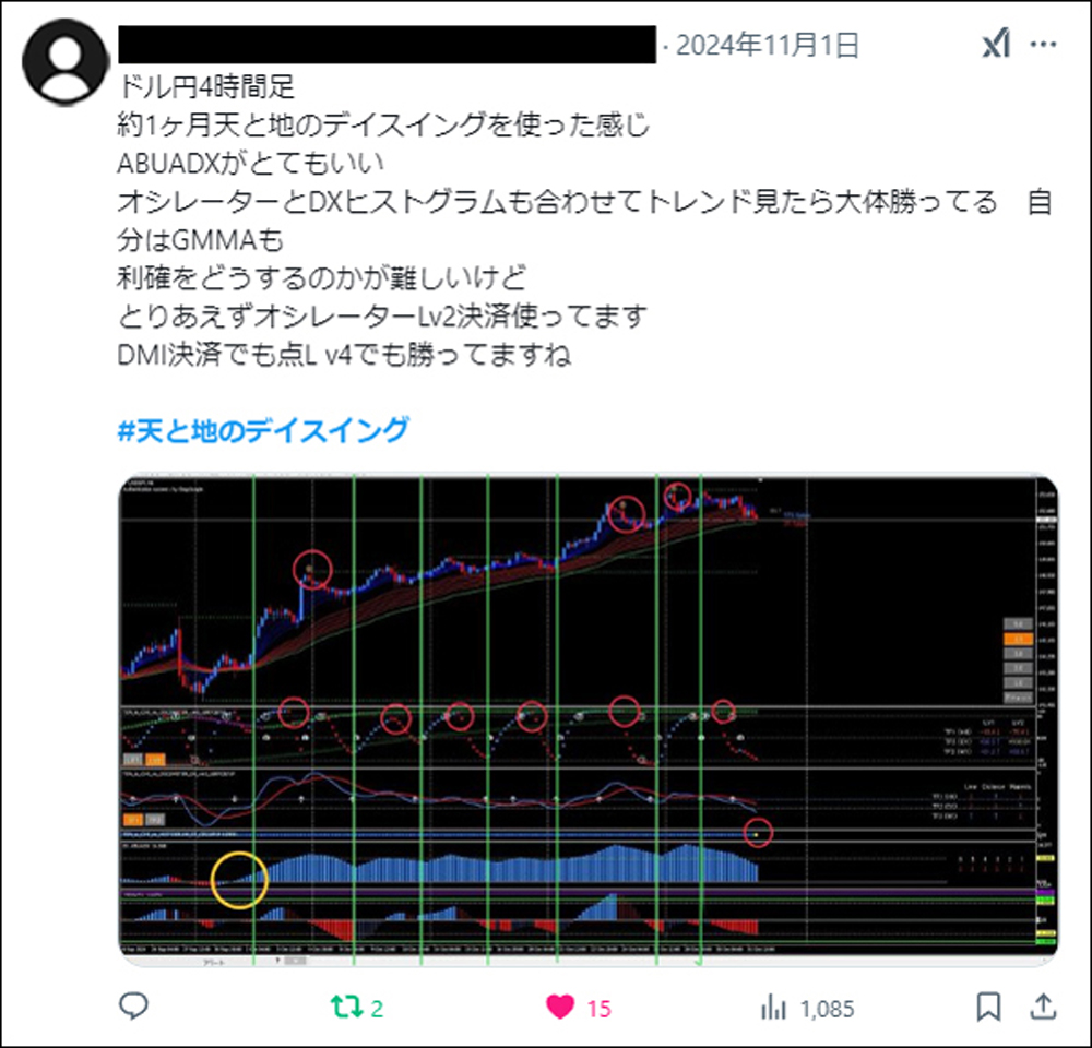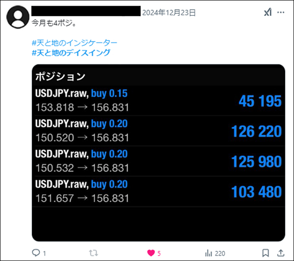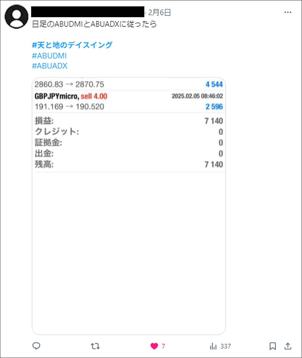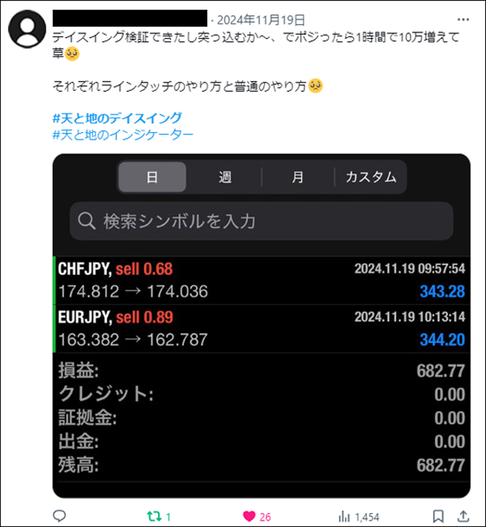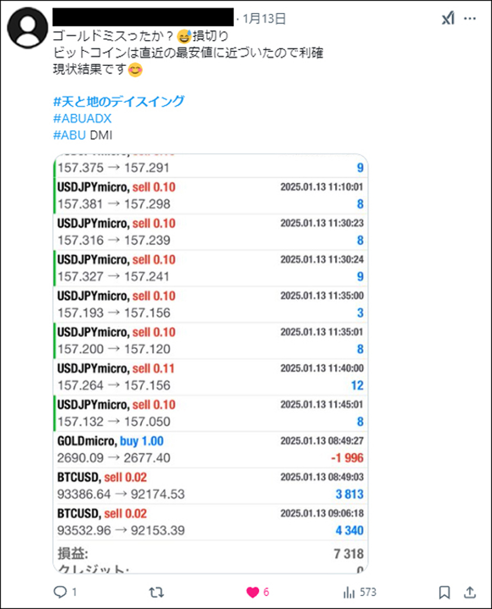 トレードで勝ち続ける秘訣は「手法を信じる事」です。この信じる気持ちが、ポジションを持ち続ける際のメンタルに大きく関わってきます。ユーザー様からのポストをこのようにご紹介する理由の一つに「本ツールのトレード手法を使って成功されている方が数えきれない程いる」という紛れもない事実を皆様にご認識していただきたいという事がございます。是非最後まで読んでいただけますと幸いです。