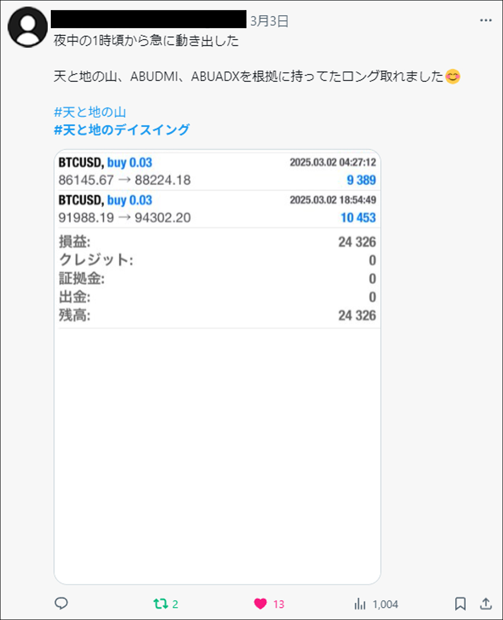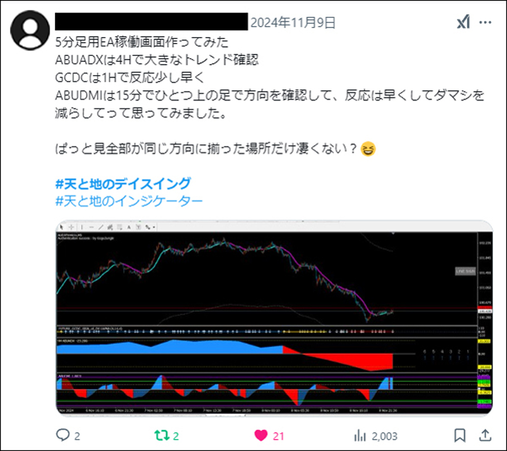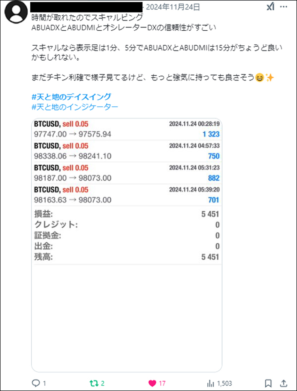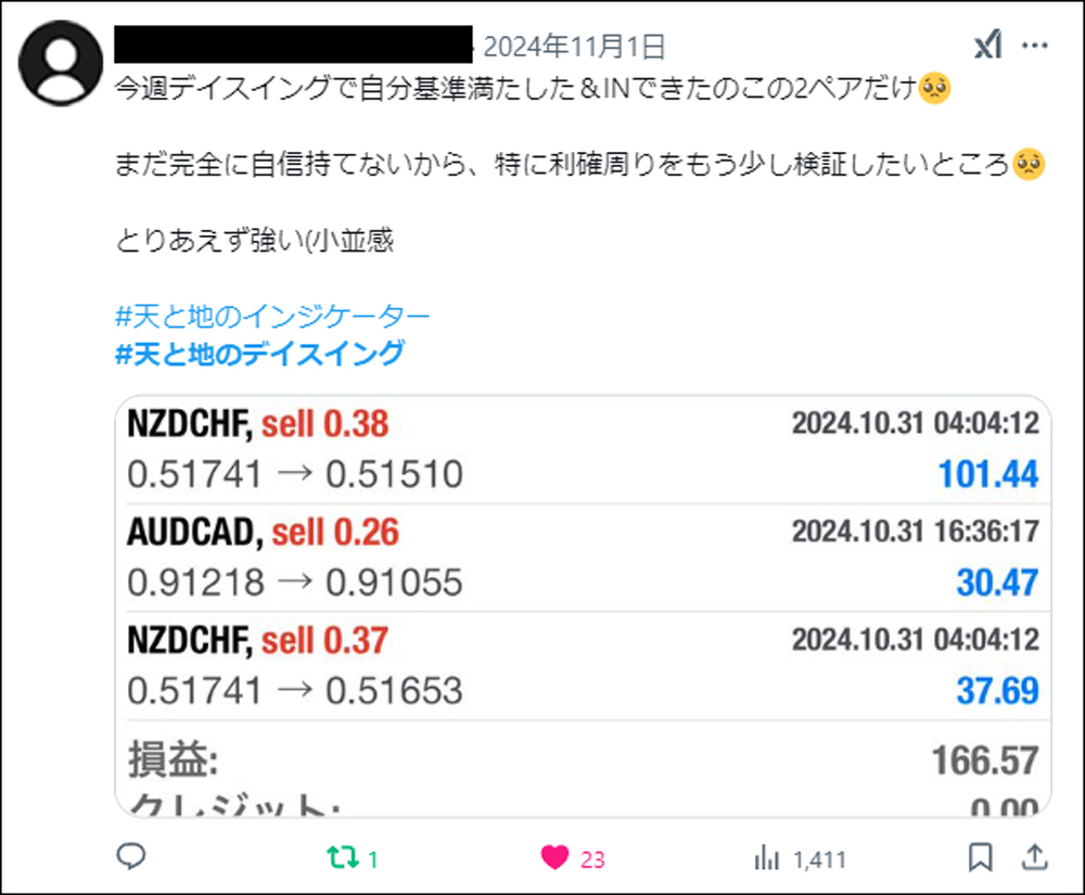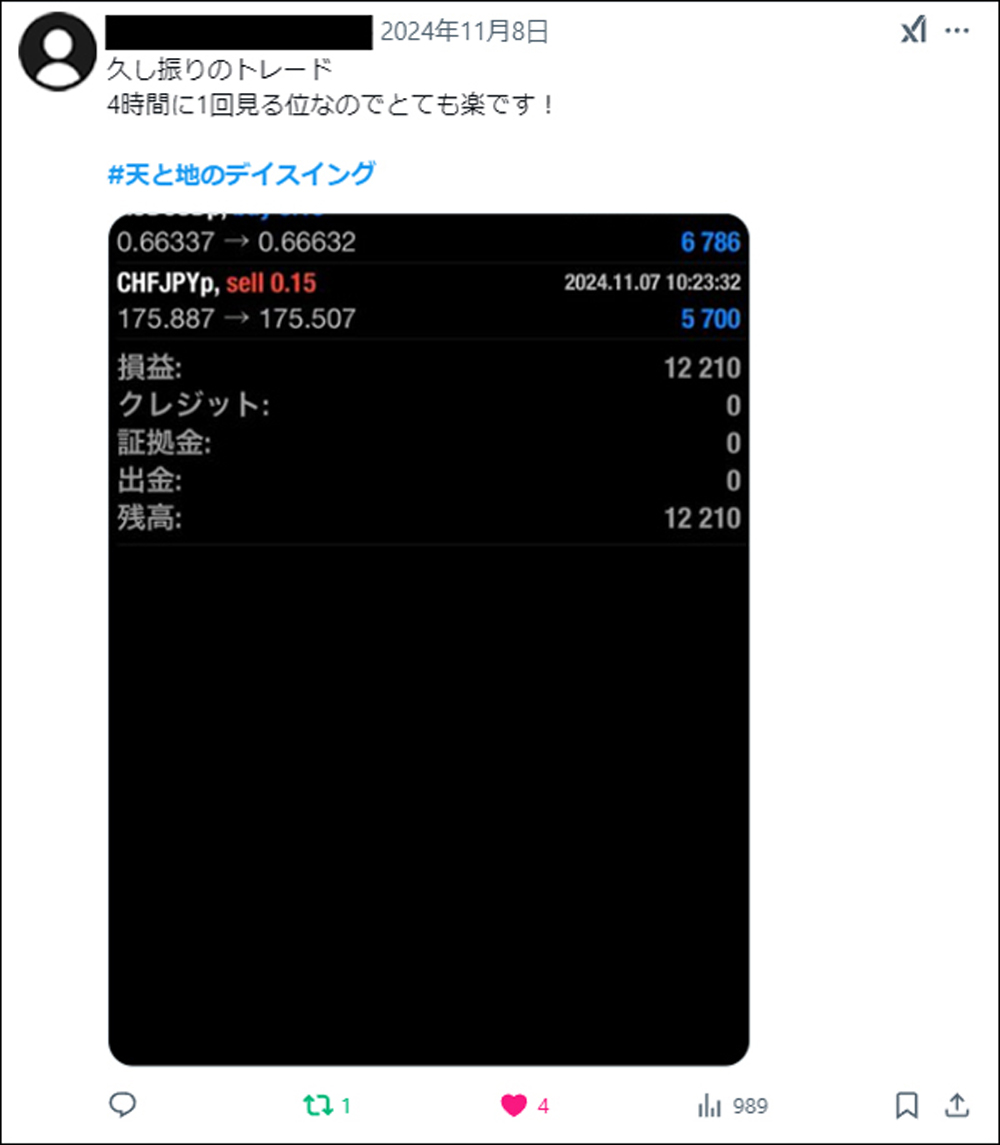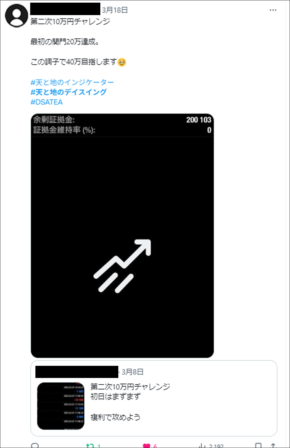 トレードで勝ち続ける秘訣は「手法を信じる事」です。この信じる気持ちが、ポジションを持ち続ける際のメンタルに大きく関わってきます。ユーザー様からのポストをこのようにご紹介する理由の一つに「本ツールのトレード手法を使って成功されている方が数えきれない程いる」という紛れもない事実を皆様にご認識していただきたいという事がございます。是非最後まで読んでいただけますと幸いです。