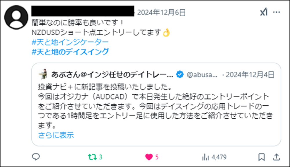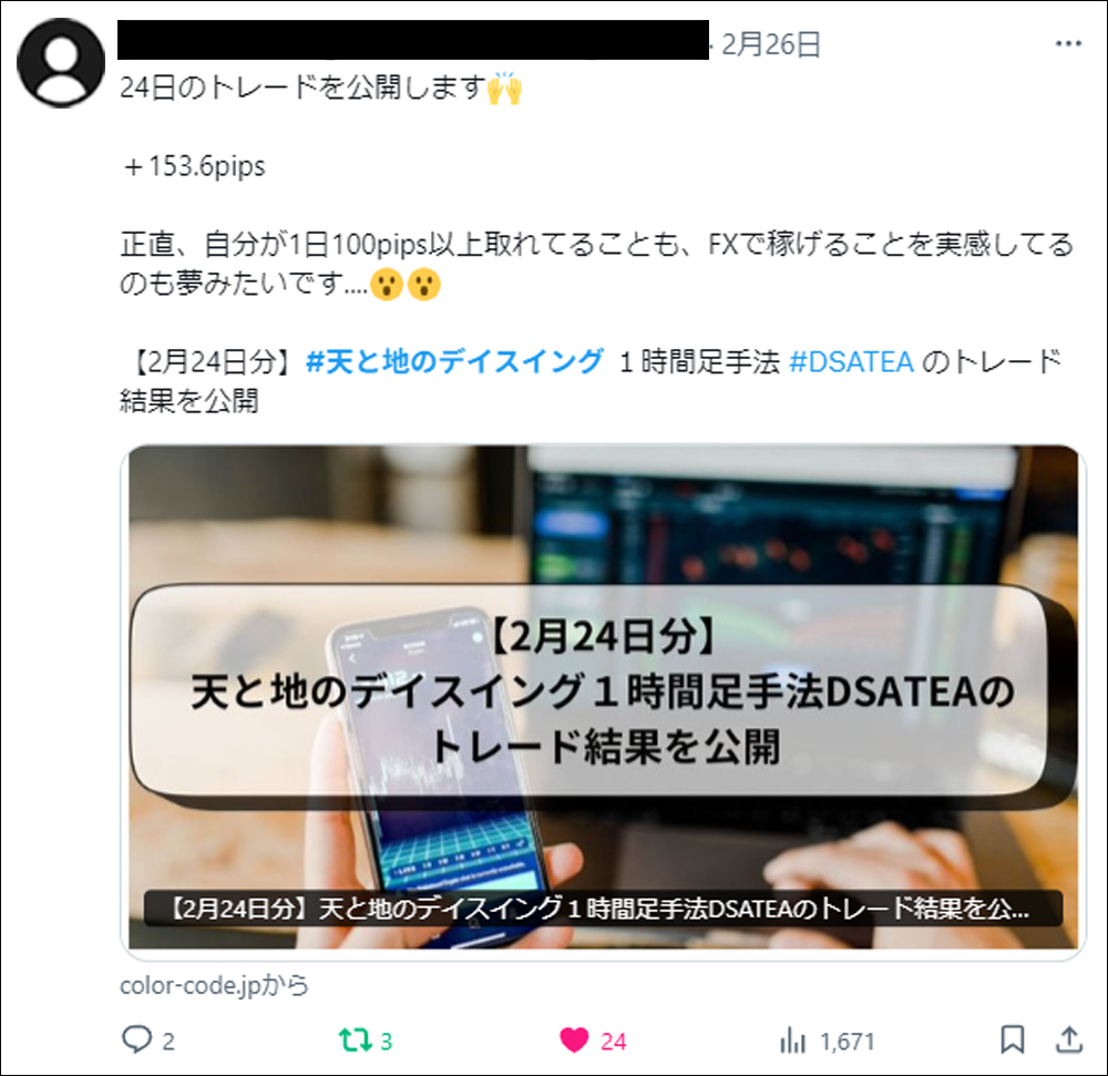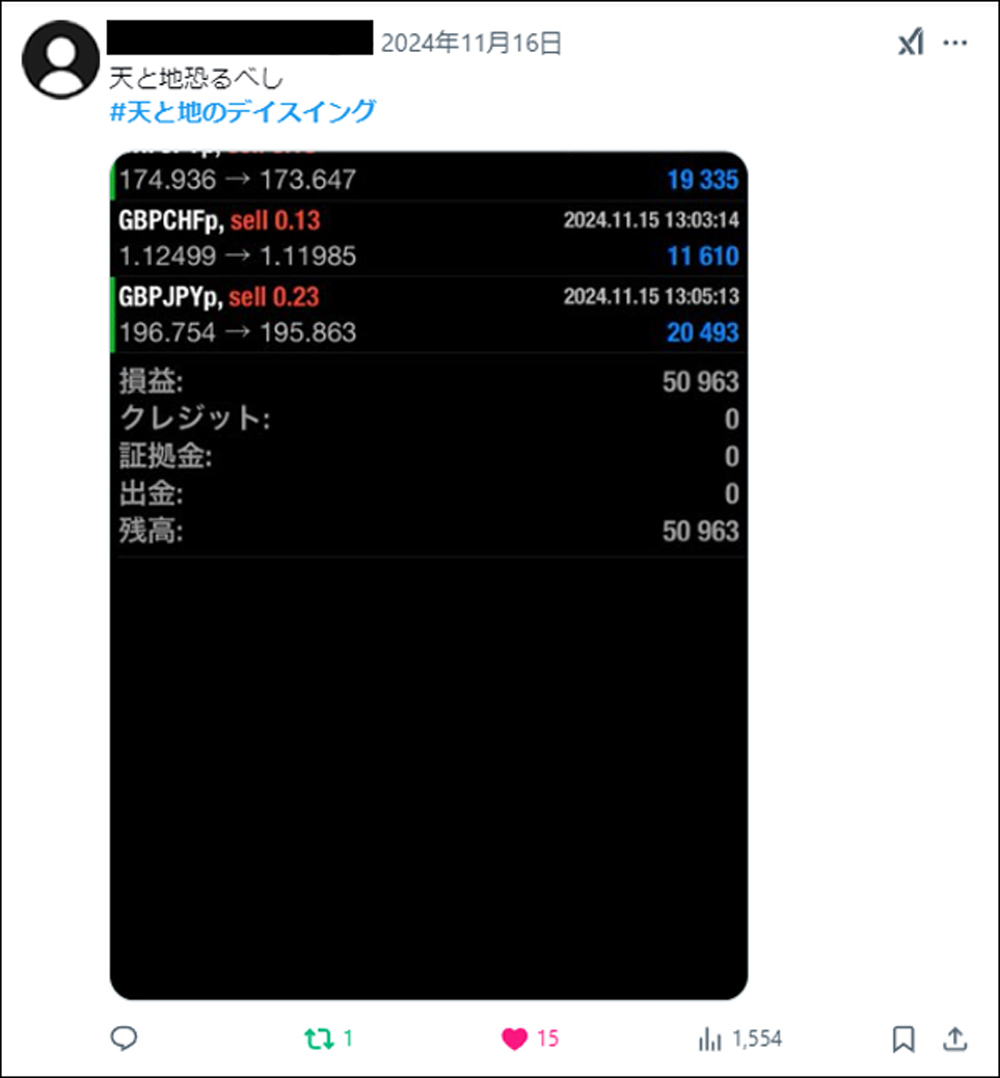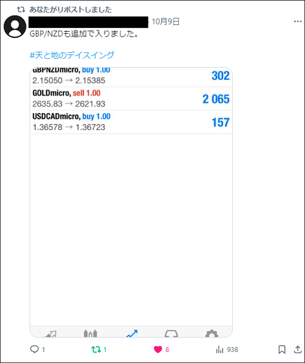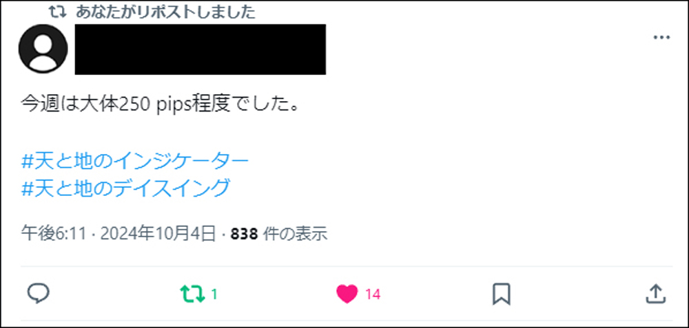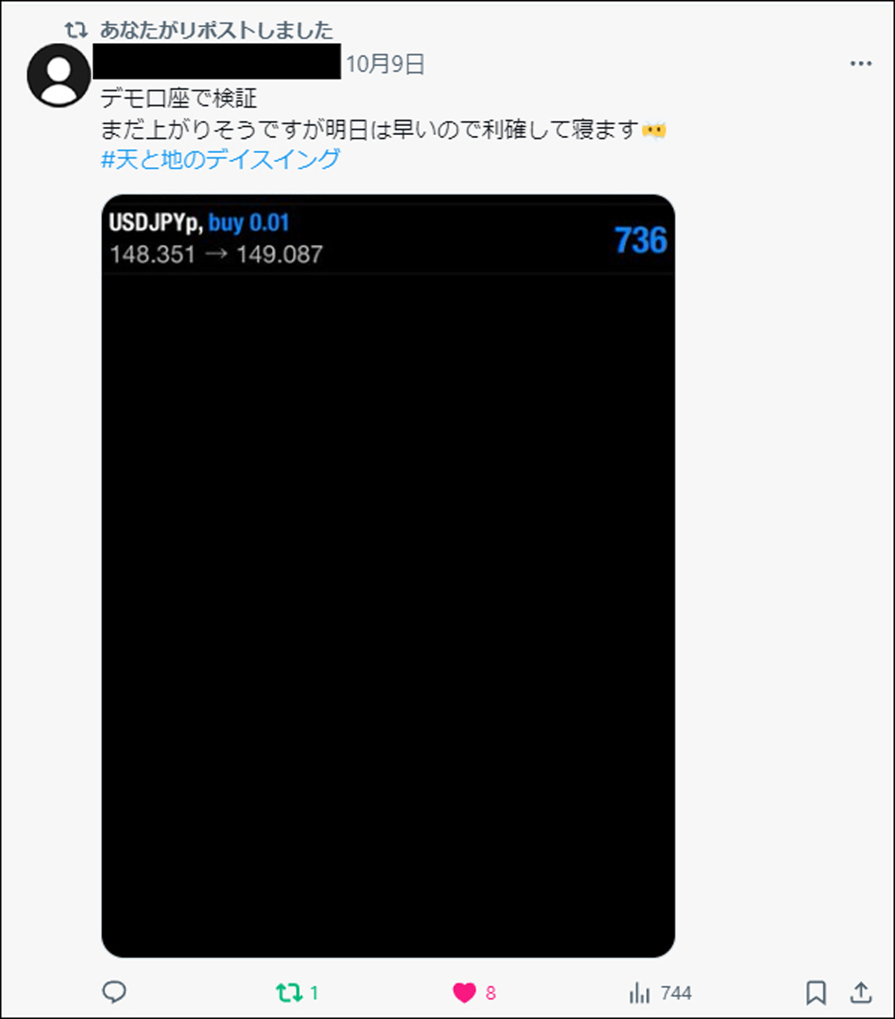 トレードで勝ち続ける秘訣は「手法を信じる事」です。この信じる気持ちが、ポジションを持ち続ける際のメンタルに大きく関わってきます。ユーザー様からのポストをこのようにご紹介する理由の一つに「本ツールのトレード手法を使って成功されている方が数えきれない程いる」という紛れもない事実を皆様にご認識していただきたいという事がございます。是非最後まで読んでいただけますと幸いです。