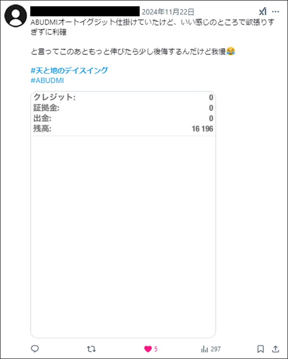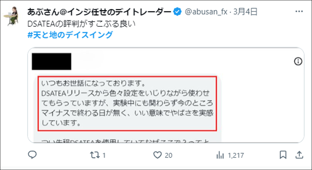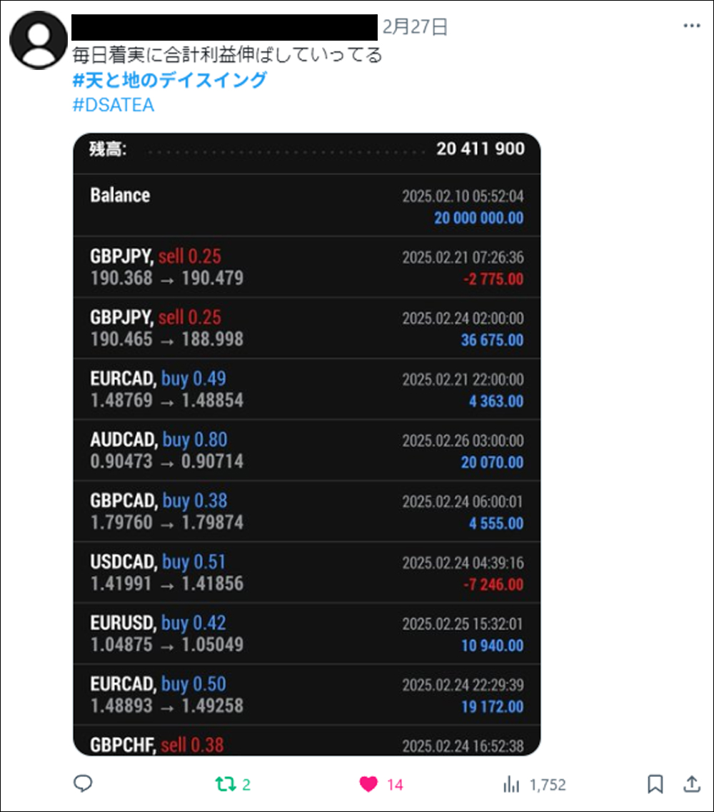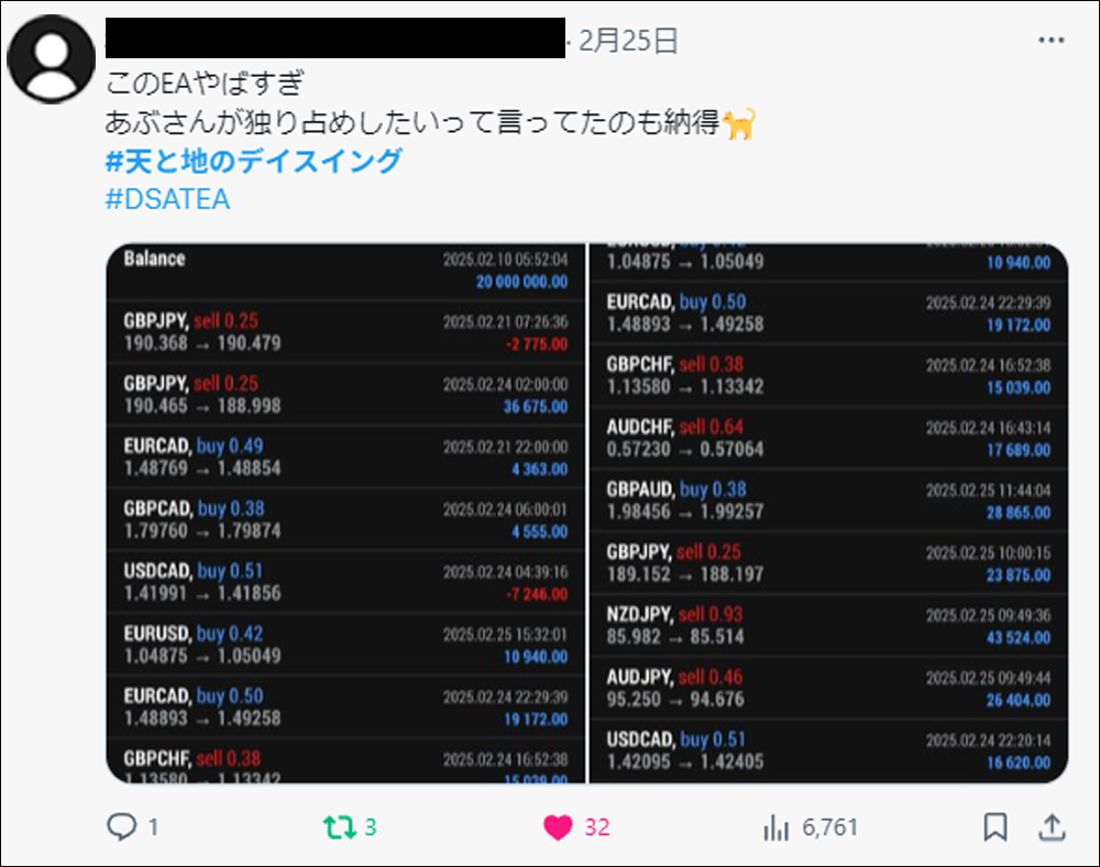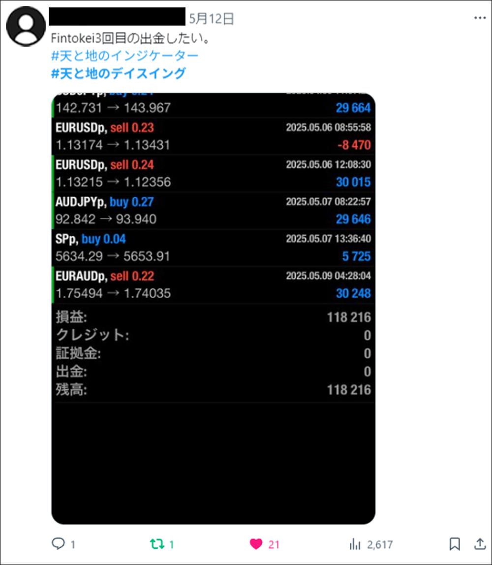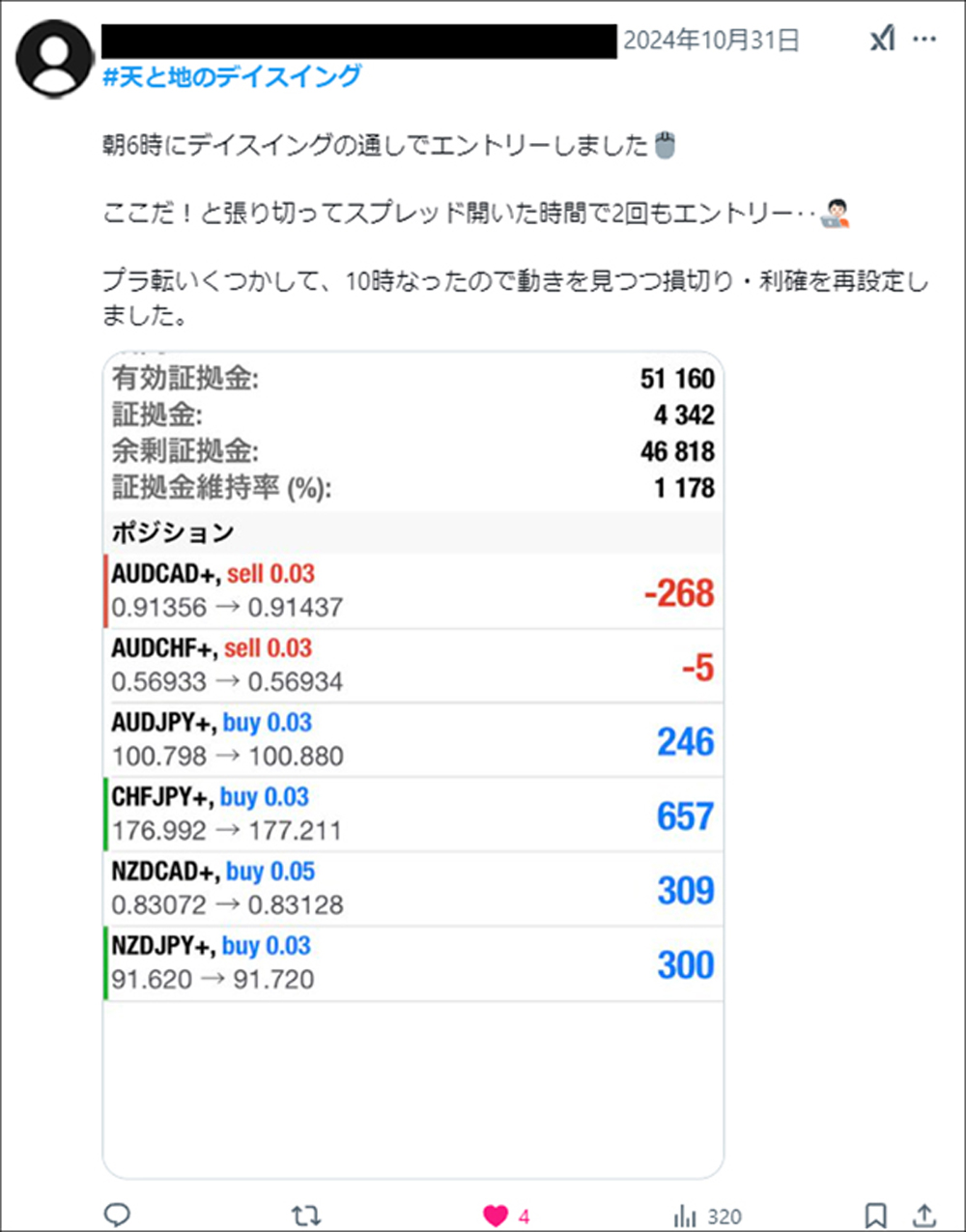 トレードで勝ち続ける秘訣は「手法を信じる事」です。この信じる気持ちが、ポジションを持ち続ける際のメンタルに大きく関わってきます。ユーザー様からのポストをこのようにご紹介する理由の一つに「本ツールのトレード手法を使って成功されている方が数えきれない程いる」という紛れもない事実を皆様にご認識していただきたいという事がございます。是非最後まで読んでいただけますと幸いです。