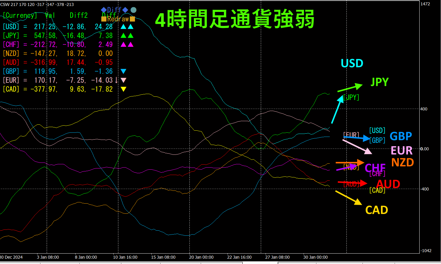 4時間足では、USD、JPY、CHFが上向き、NZDが水平、CAD、EUR、GBPが下向きになっています。