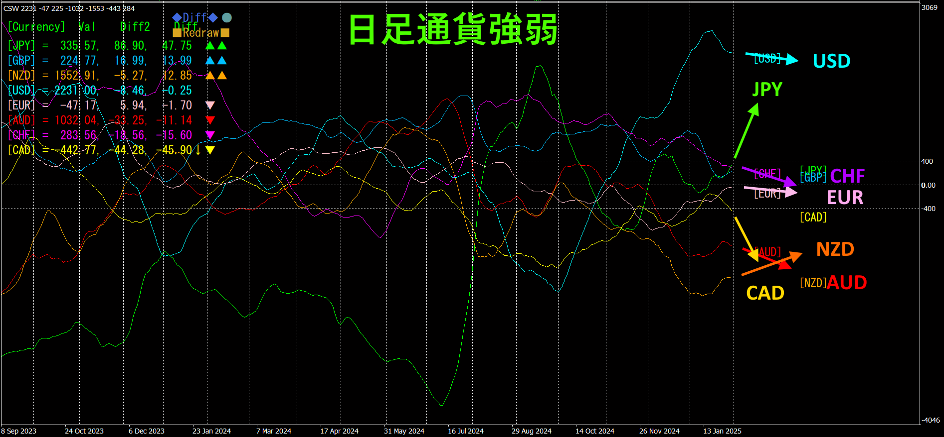 JPY、GBP、NZDが上向きです。一方、CAD、CHF、AUD、EUR、USDが下向きになっています。日足通貨強弱チャートでは、JPYの急角度な上昇とCADの急下降が目立っています。