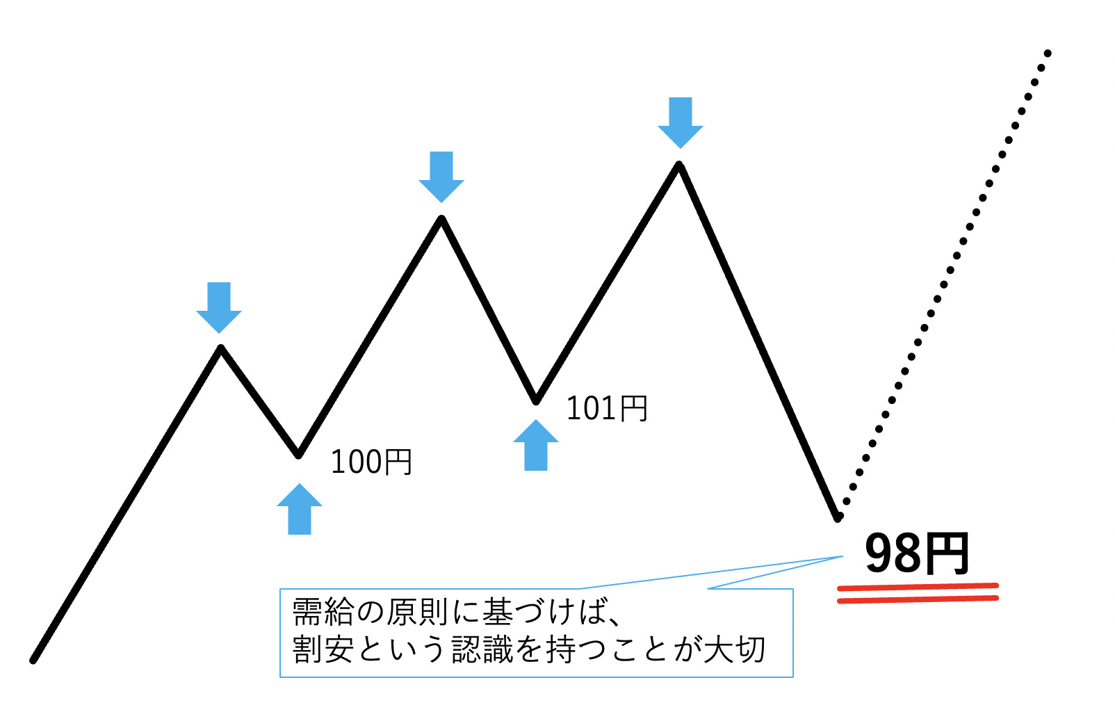 このシチュエーションで98円という価格が圧倒的に「割安」だと認識し、買いポジションを持つという意思決定ができるのが本質的なトレーダーです。